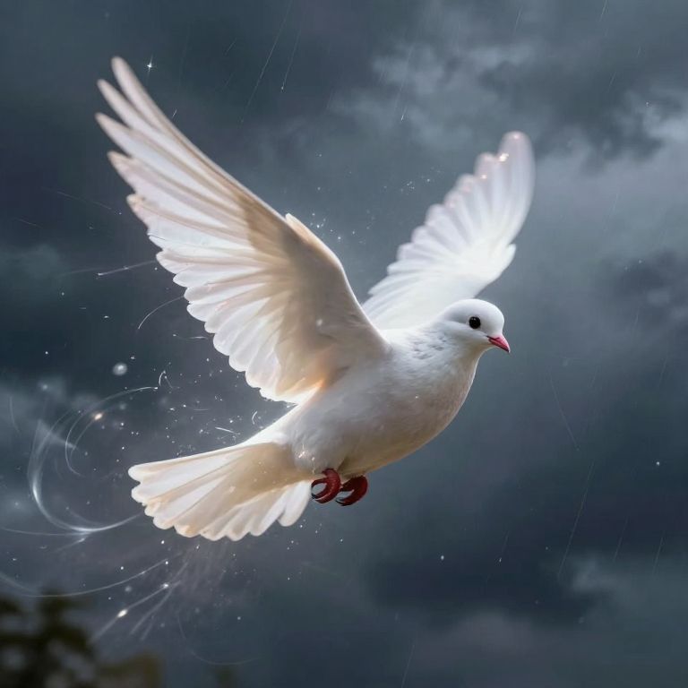 A luminous dove soars through a tempestuous sky, its wings alight with ethereal energy, symbolizing the transcendence of spirit over chaos and the enduring hope that emerges from the storm.