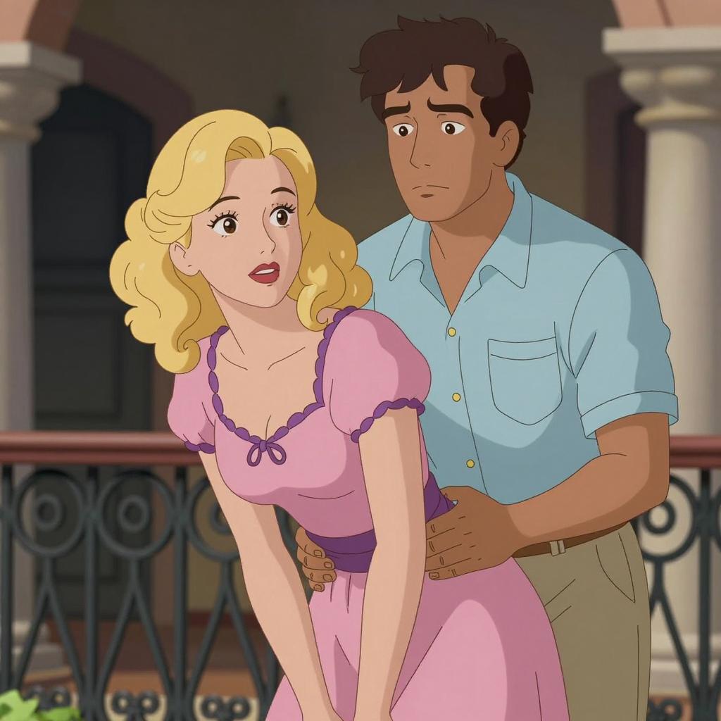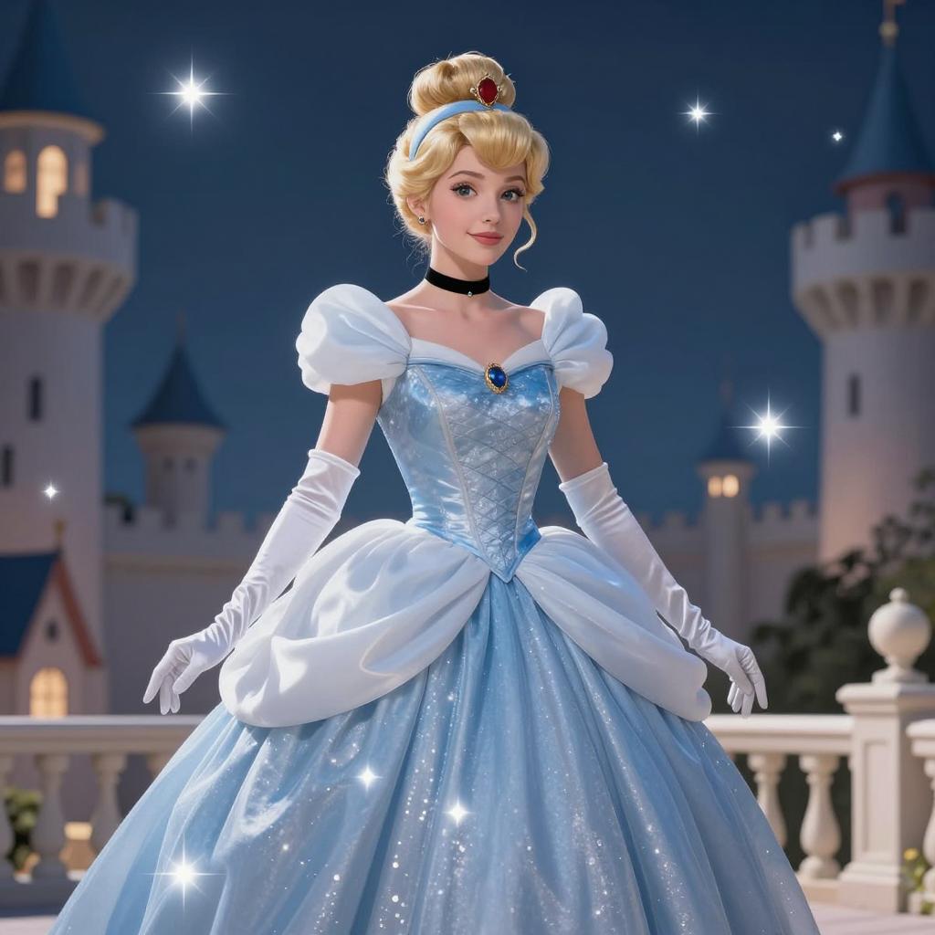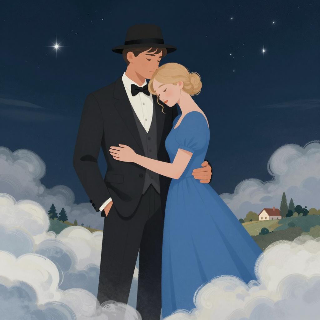 Colorful illustration of a smiling man and woman dancing. The man has brown hair and wears a yellow military-style jacket with black buttons, white gloves, and dark pants. The woman has blonde hair with a blue headband, a white off-shoulder dress, blue earrings, and a black choker. They have their arms around each other, set against a blue background featuring a castle silhouette and sparkling stars.