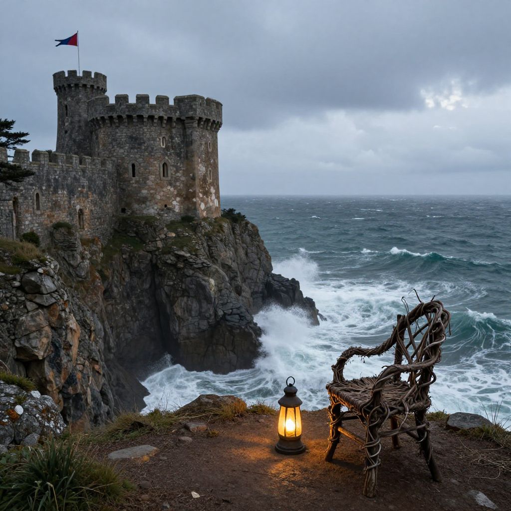 Castleandchair set on a cliff overlooking a vast ocean, weathered stone castle with flags fluttering, a lone elegant chair made of twisted vines and branches beside a flickering lantern, dramatic waves crashing below, atmospheric and cinematic fantasy landscape.