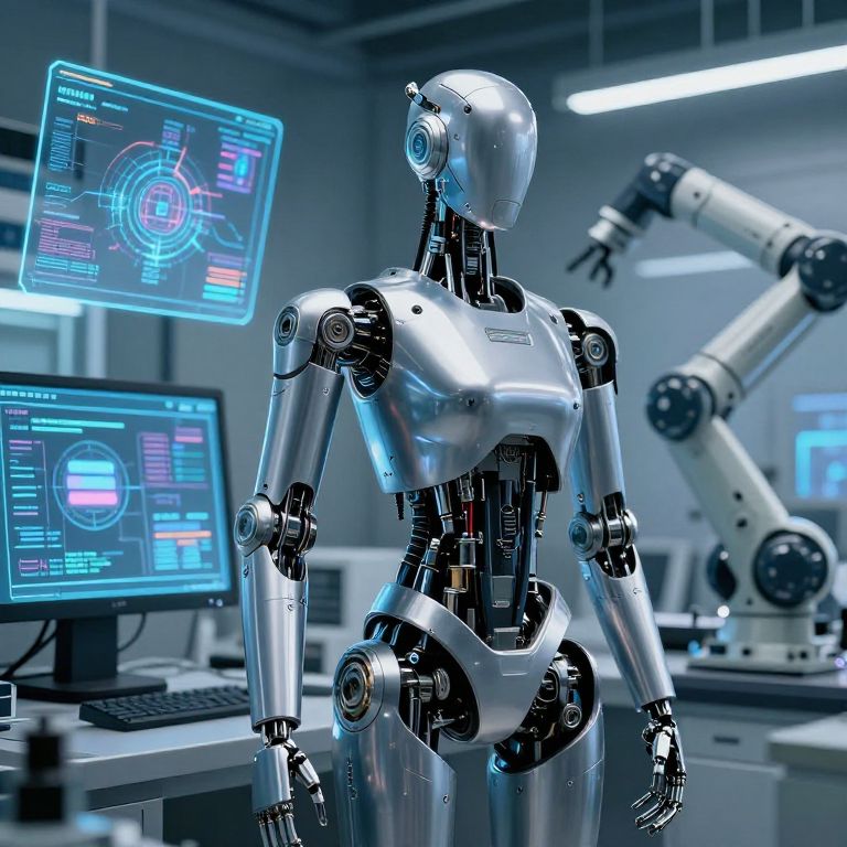 Photorealistic CGI of a shiny silver humanoid robot in a high-tech lab, surrounded by glowing blue computer screens and a microscope.
