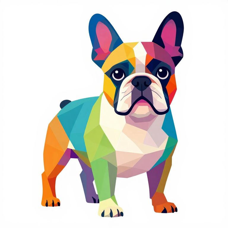 The image features a vibrant, low-poly, 2D illustration of a colorful French Bulldog. The dog is depicted in a standing pose, with its body composed of various geometric shapes filled with a spectrum of bright, contrasting colors. The colors include shades of blue, green, orange, pink, and purple, creating a striking and dynamic visual effect. The dog's face is particularly detailed, with intricate lineart defining its features, including its large, expressive eyes, small black nose, and wrinkled face. The overall composition is balanced, with the dog centrally positioned against a white background, which enhances the vividness of the colors and the geometric shapes. The transparent background allows the dog to stand out prominently, making it the focal point of the image. The low-poly style gives the illustration a modern, digital feel, while the use of bright, saturated colors and detailed lineart adds a playful and artistic touch.