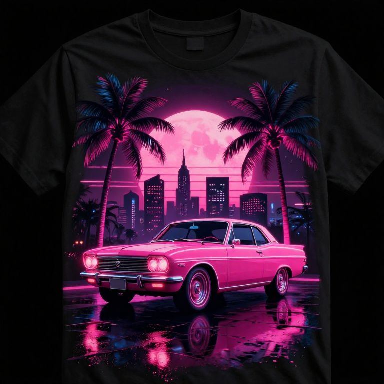 The image showcases a striking t-shirt design featuring a vibrant, neon-inspired scene. Dominating the center is a sleek, retro car, rendered in a glowing pink hue, with its headlights and details accentuated by neon lines. The car is positioned on a wet, reflective surface, suggesting a recent rain. Flanking the car are two towering palm trees, their fronds illuminated by the neon glow, adding a tropical ambiance to the design. In the background, a city skyline emerges, its buildings silhouetted against a large, radiant pink moon that casts a warm, neon light over the scene. The sky is filled with dynamic, neon-colored streaks, enhancing the retro, futuristic feel of the design. The overall composition is balanced, with the car and palm trees creating a focal point, while the neon elements and reflective surface add depth and energy to the image.