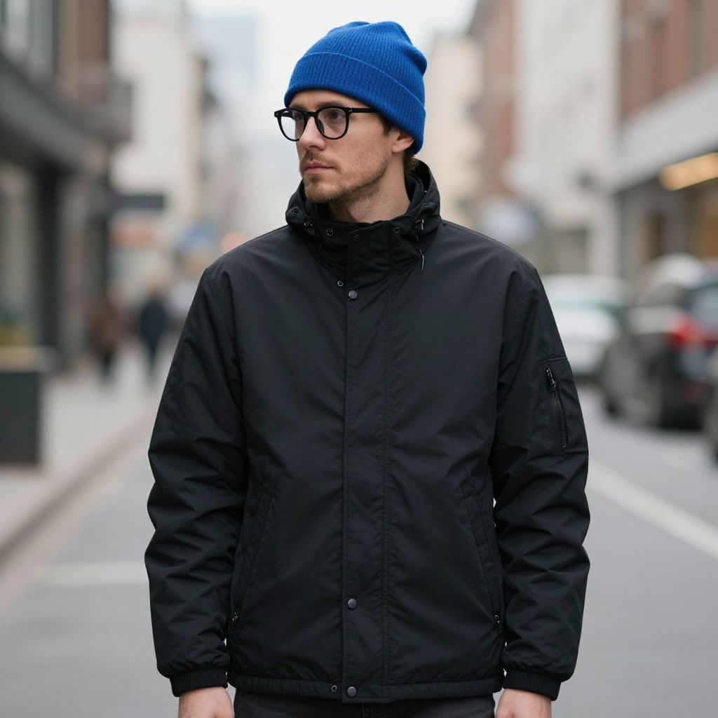 "Trending Winter Wear, man in a black jacket and a blue hat and glasses"