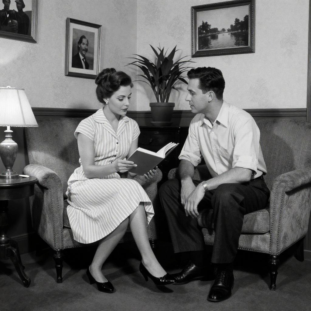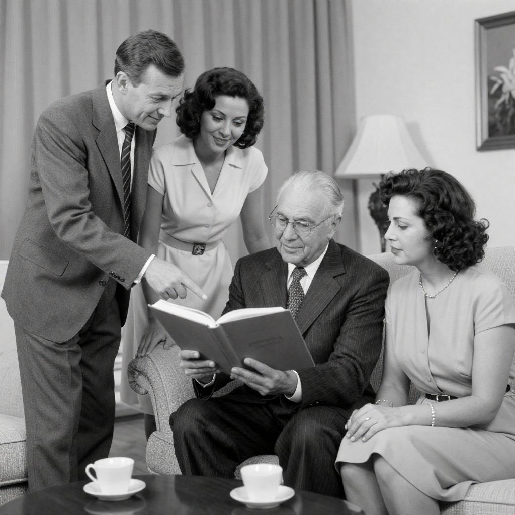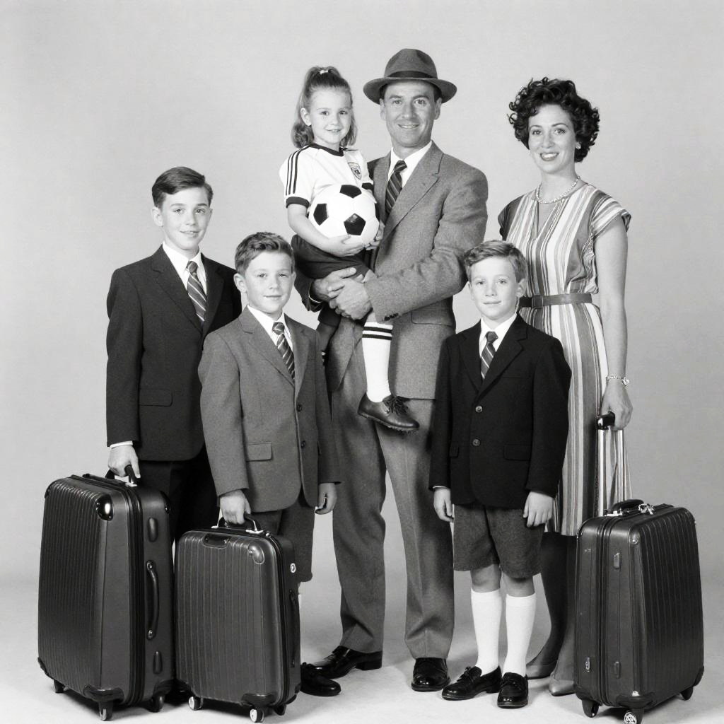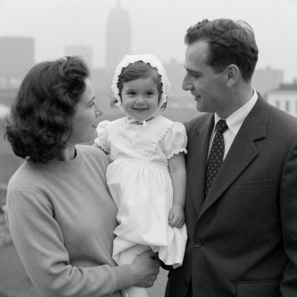 Black-and-white photograph of a family. Man in suit with patterned tie, woman in light sweater, holding young girl in dress and white bonnet. Man and woman look at each other, girl smiles. Background shows blurred cityscape. Man on right, woman and girl on left.