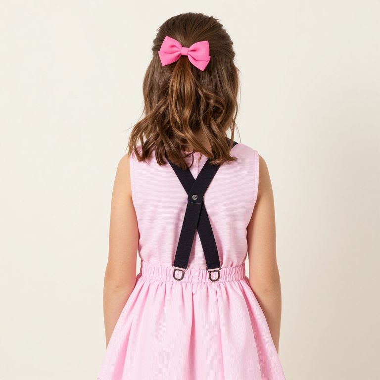 Photograph of a young girl with wavy brown hair, wearing a pink dress with black suspenders and a pink bow, facing away against a plain