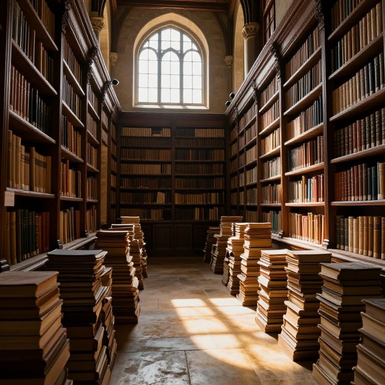 Sunlight streams through arched windows, casting golden patterns on the aged stone floor of a grand library, where towering wooden bookshelves lined with countless volumes stretch into the shadows, flanked by stacks of unbound manuscripts awaiting discovery.