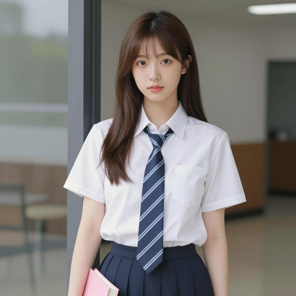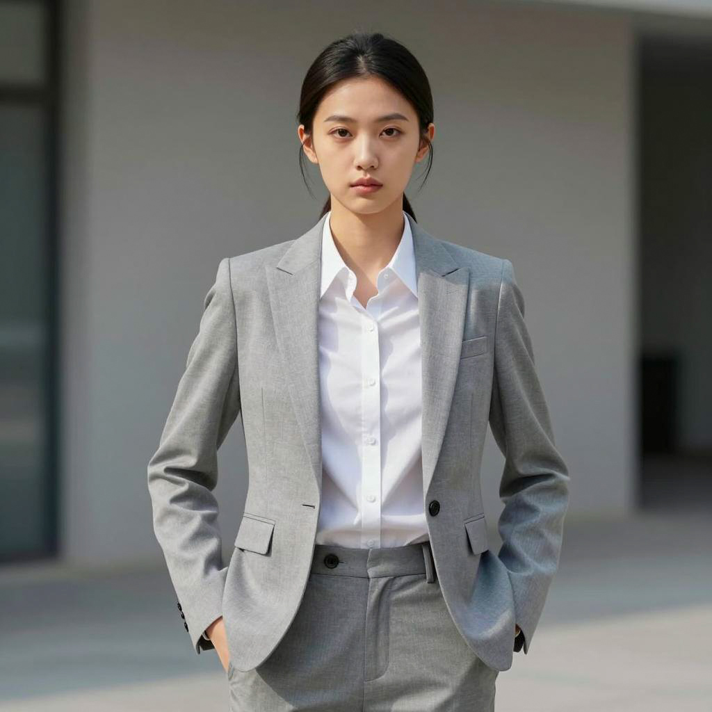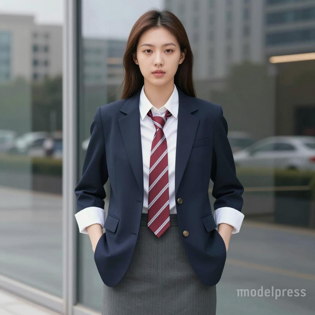 Portrait of an Asian woman with straight brown hair wearing a navy blue blazer with rolled-up sleeves, a white shirt, a red and white striped tie, and a grey pinstripe skirt. She stands confidently with her hands in her jacket pockets in front of a glass window with urban buildings blurred in the background. She has a neutral facial expression.