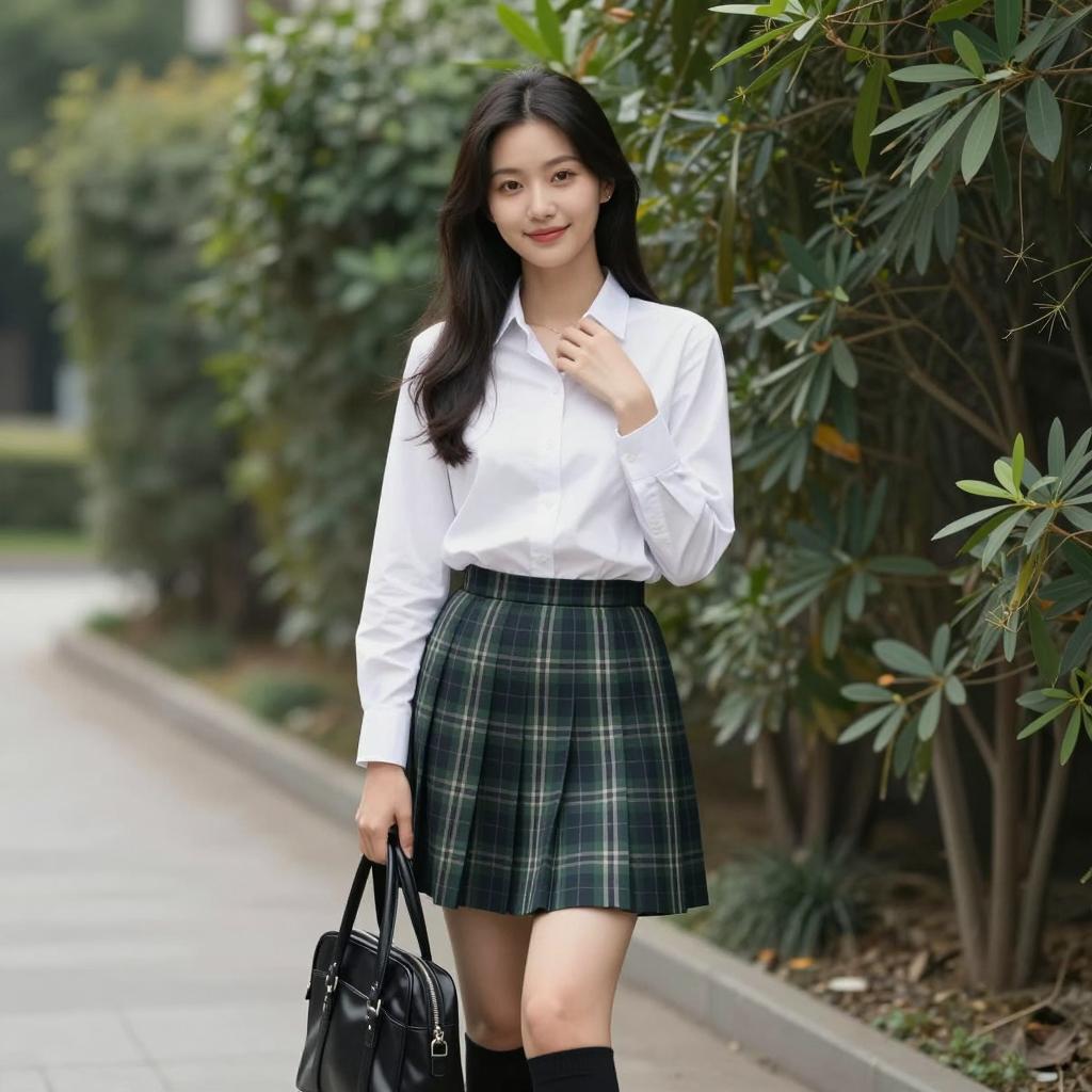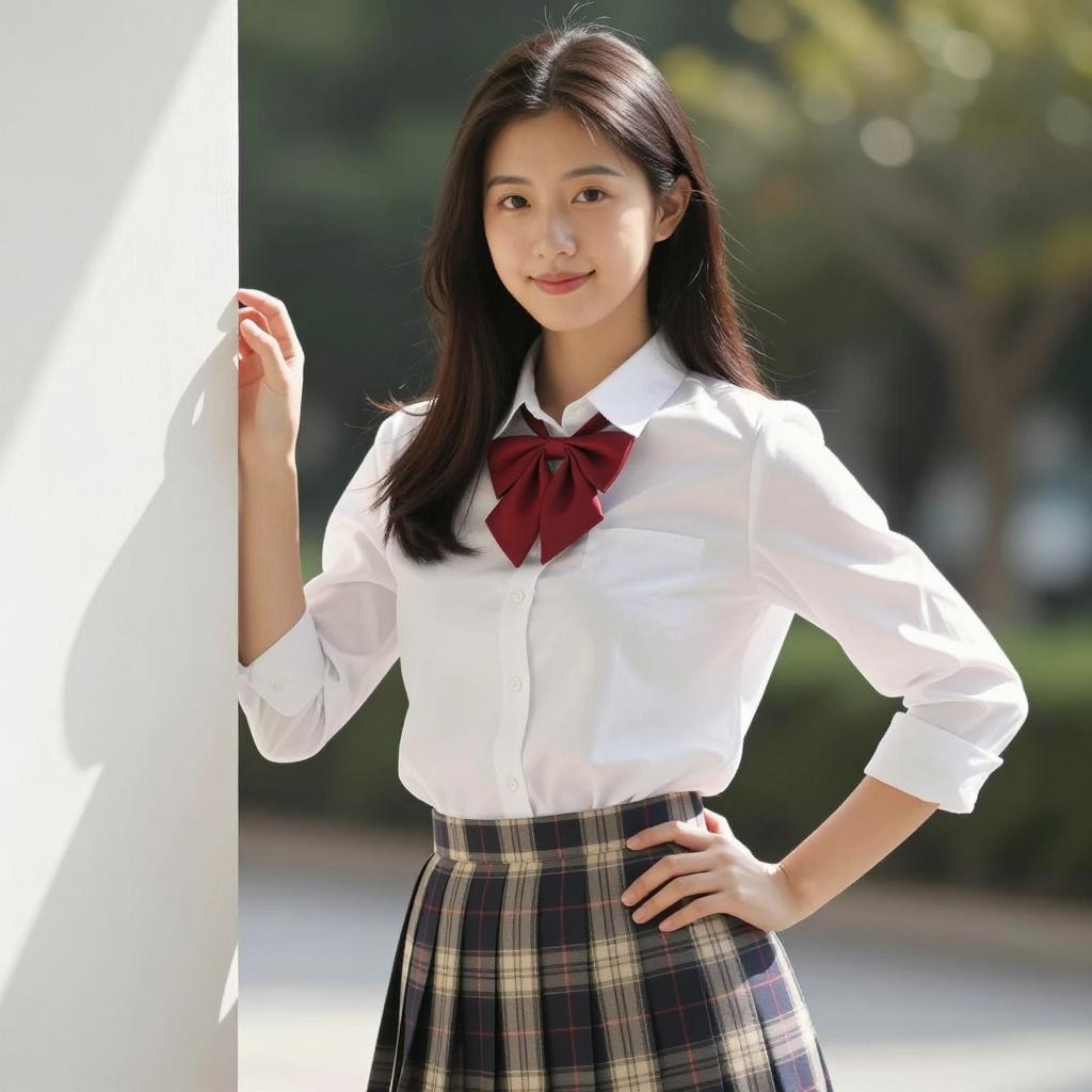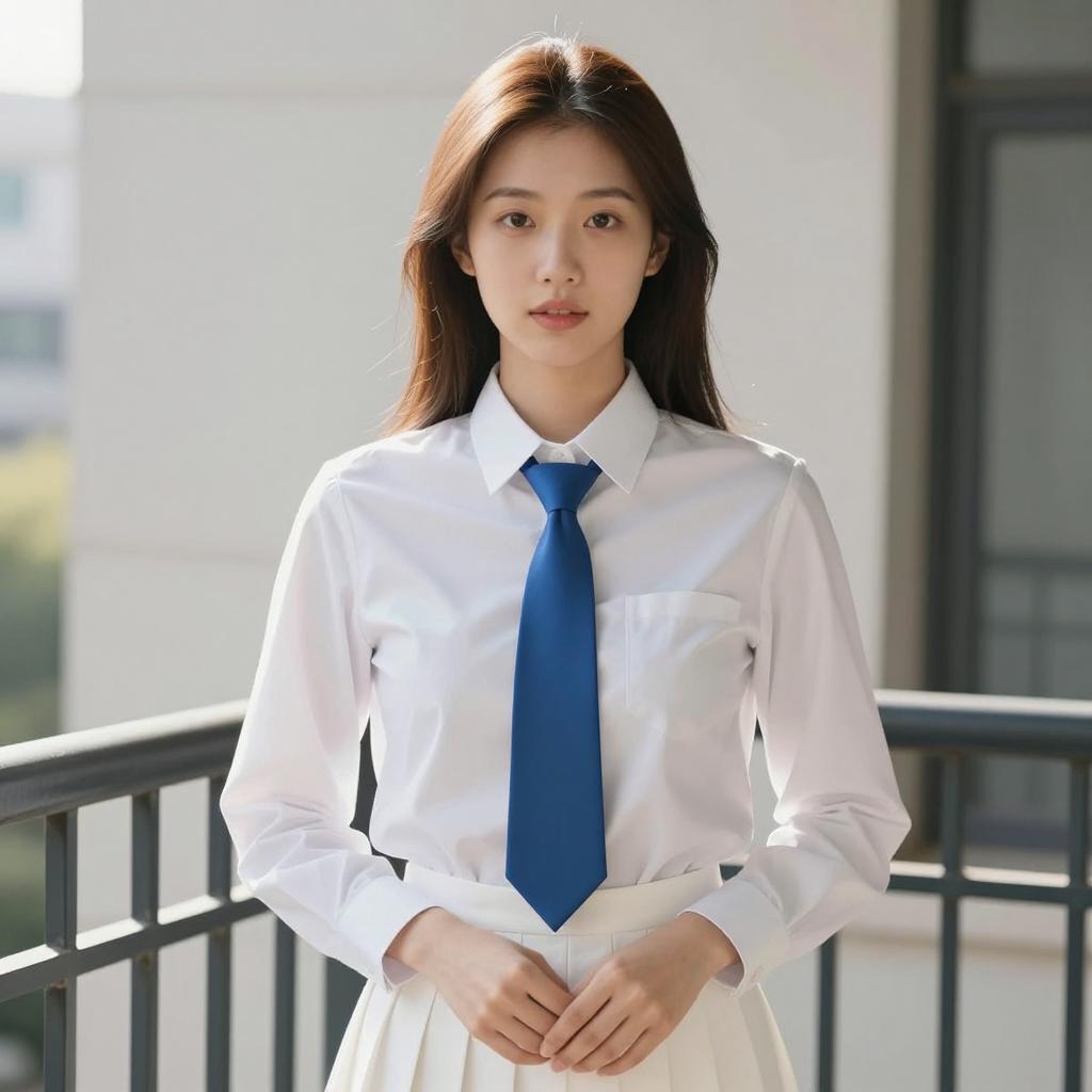 Portrait of an Asian woman with straight brown hair wearing a navy blue blazer with rolled-up sleeves, a white shirt, a red and white striped tie, and a grey pinstripe skirt. She stands confidently with her hands in her jacket pockets in front of a glass window with urban buildings blurred in the background. She has a neutral facial expression.
