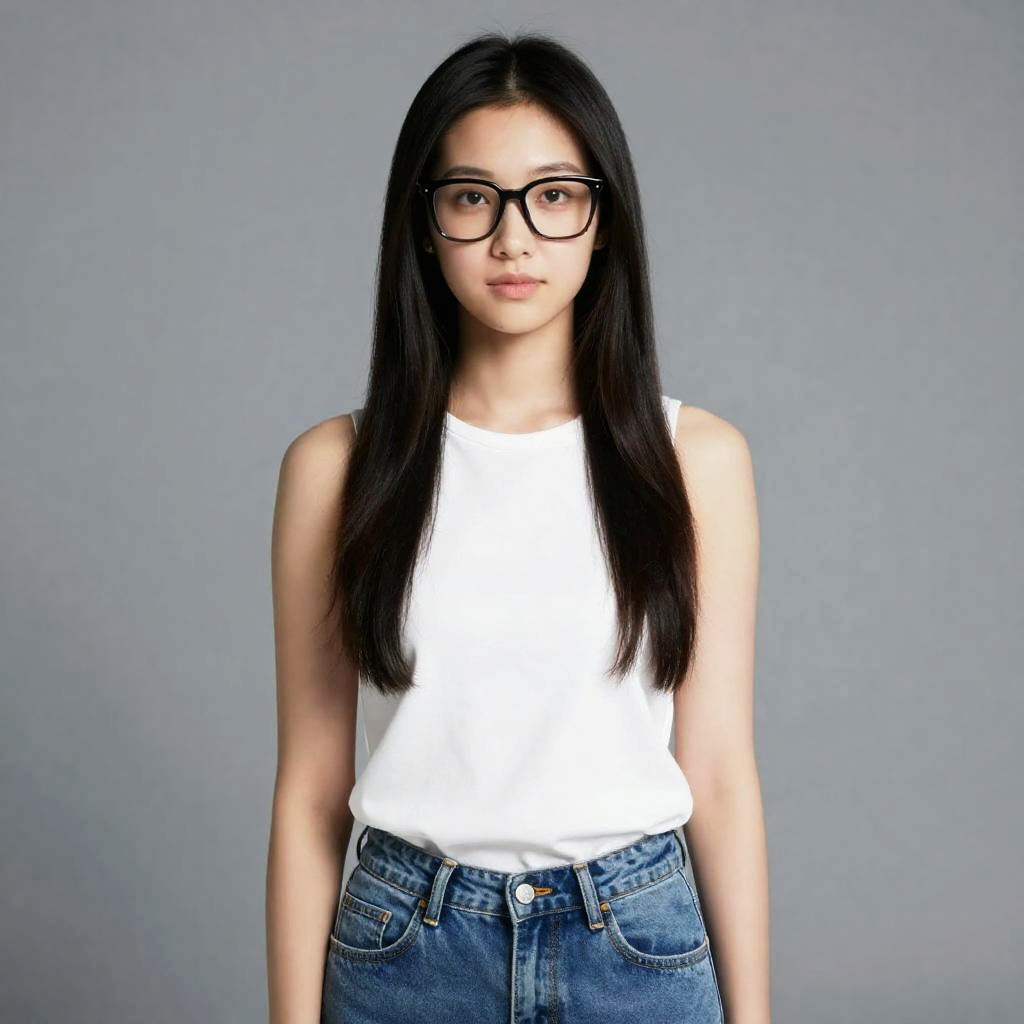 Ladies Hairstyles For Over With Glasses, a woman in a white top and jeans standing in front of a gray background