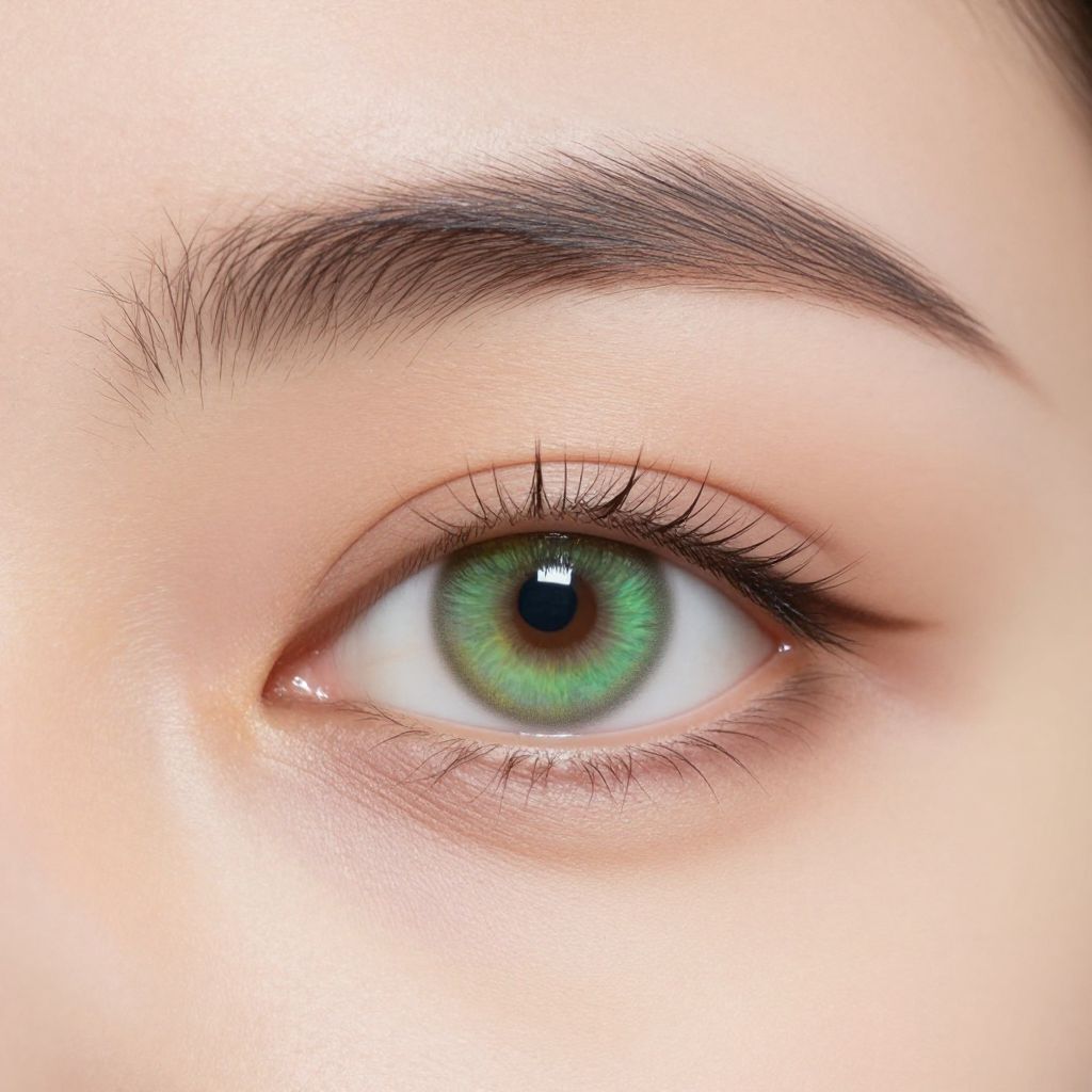 Gorgeous real human eye with pretty eyebrow, gorgeous eye color, multifaceted light green and deep green eye, real photograph, dlsr, stunning, zoomed out, full view