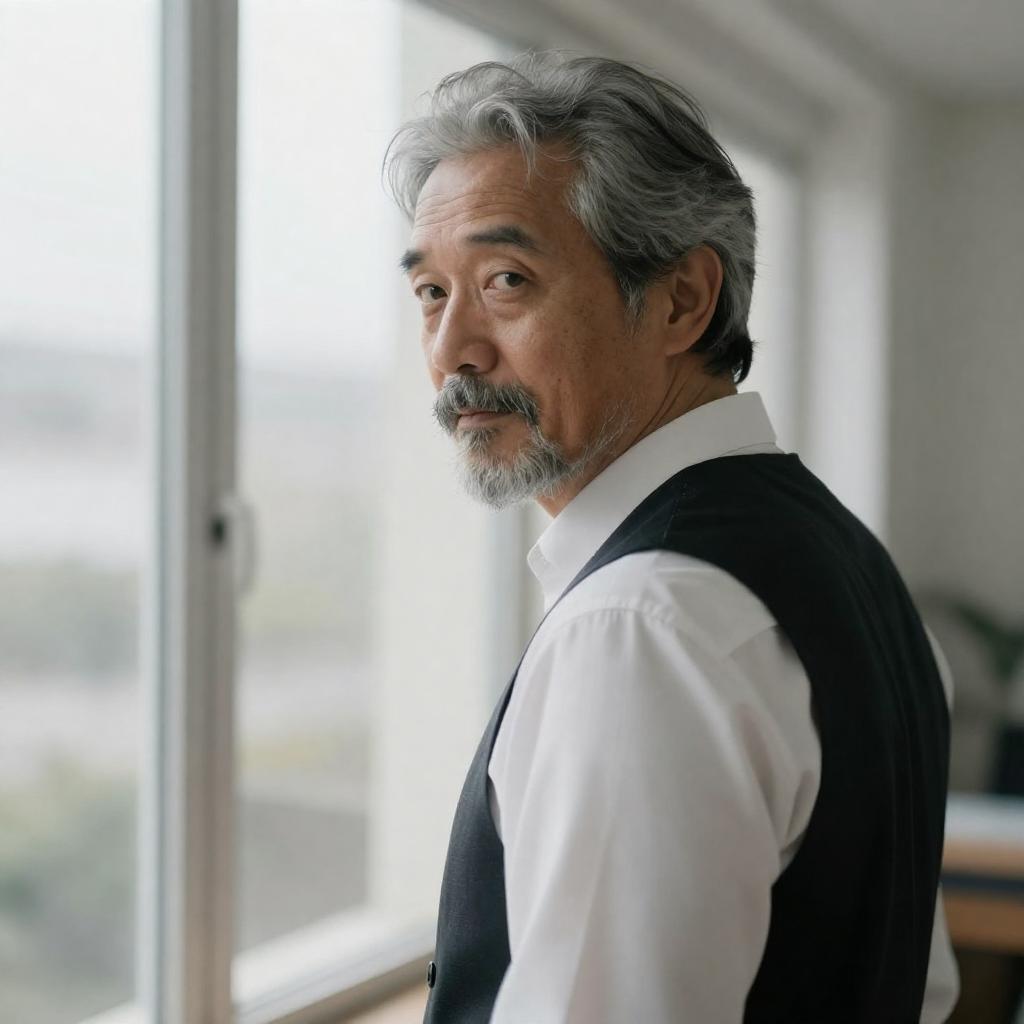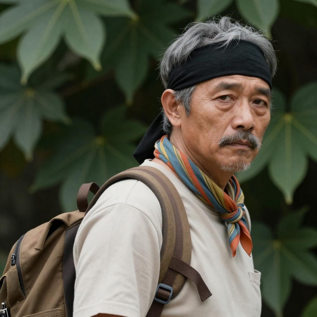 Middle-aged man with graying hair, black headband, and mustache, wearing a beige shirt, colorful scarf, and brown backpack. A small, worn-out backpack is slung over his shoulder. Background: lush green foliage. Man's expression is serious. Photograph.