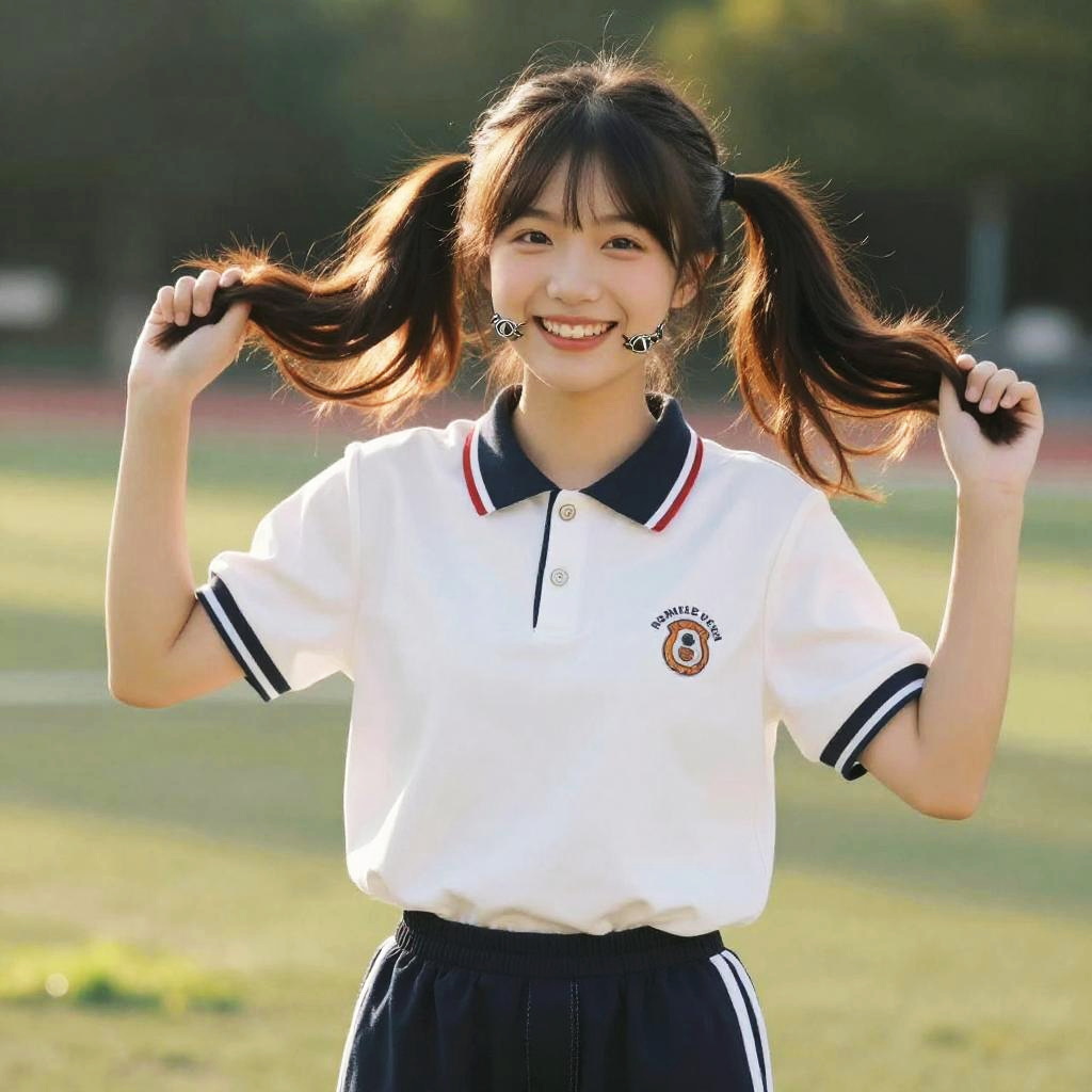 Braces pigtails hairstyle on a cheerful teenage girl, bright outdoor park setting, warm afternoon light, trendy outfit with streetwear accents, energetic and lively atmosphere
