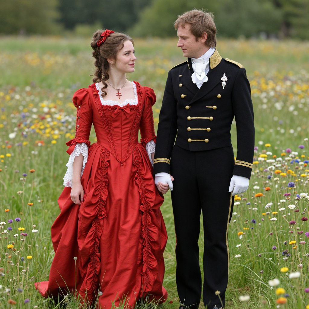 Elegantly dressed couple in period attire stands hand-in-hand amidst a field of wildflowers, with the woman wearing a vibrant red gown adorned with lace details and the man in a regal military-style jacket featuring gold embellishments and a white cravat.