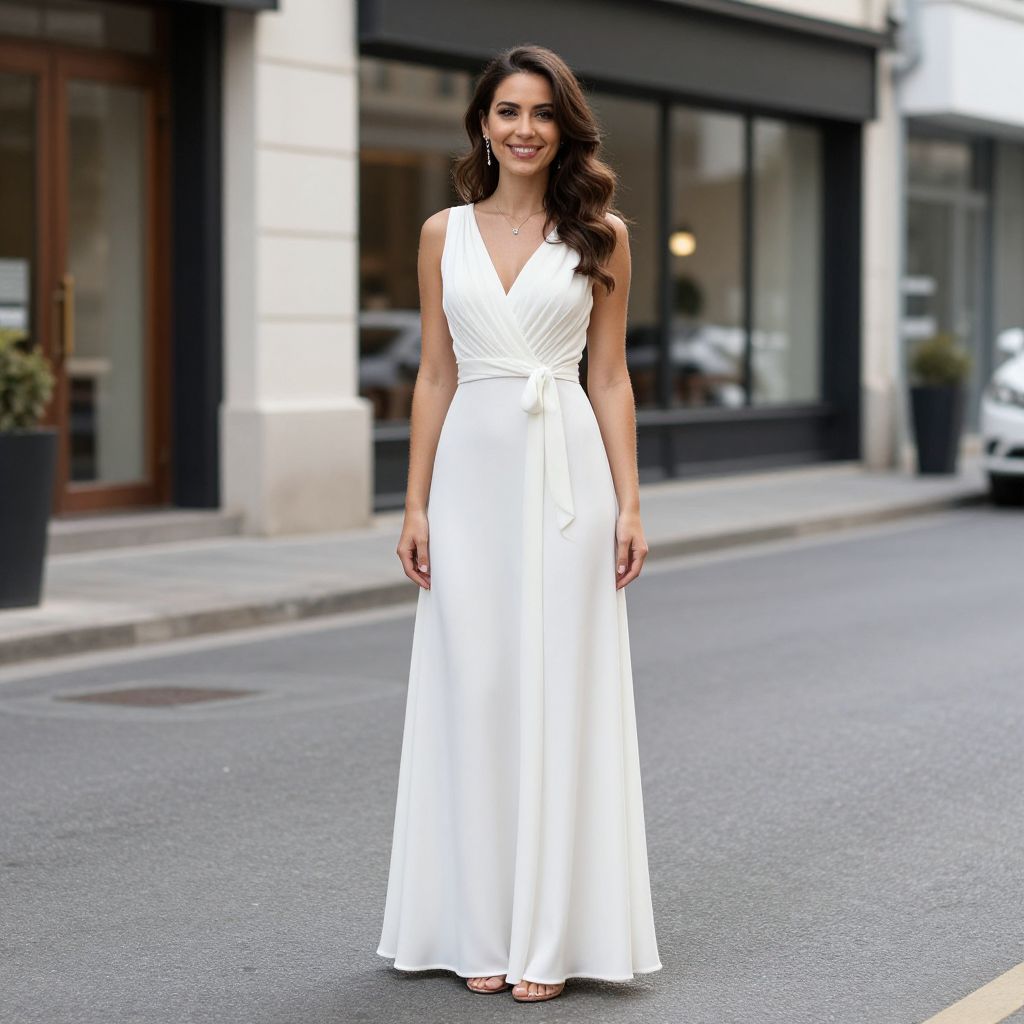 Photograph of a smiling woman with long, wavy dark brown hair standing on a city street. She wears a sleeveless, V-neck, white maxi dress with a tied waist, and black open-toe sandals. The background features a street with a black storefront, white pillars, and a parked white car. The street is paved with a yellow curb line visible. The woman's dress is flowing and the fabric appears smooth and lightweight, contrasting with the urban setting. The overall style is elegant and modern.