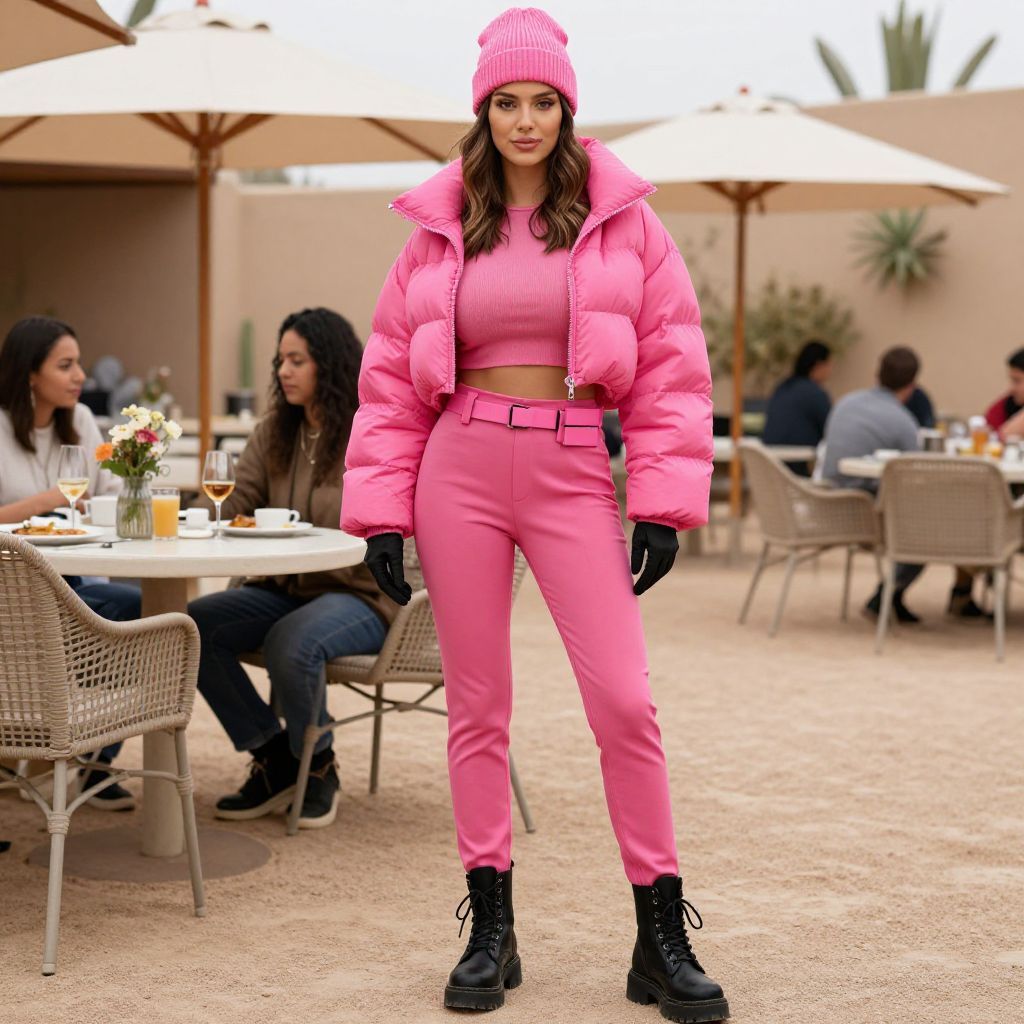 A slim woman in streetwear chic, wearing a vibrant pink puffer jacket with oversized quilting, high collar, and cropped length, paired with coordinating slim-fit trousers and chunky black lace-up boots. She accessorizes with a matching utility belt, a ribbed pink beanie, and simple black gloves. Set in an outdoor brunch setting in a desert oasis, captured in a shogakukan visual style. Sexy. Pretty face and beutiful eyes Sexy. Pretty face and beаutiful eyes. Big breasts