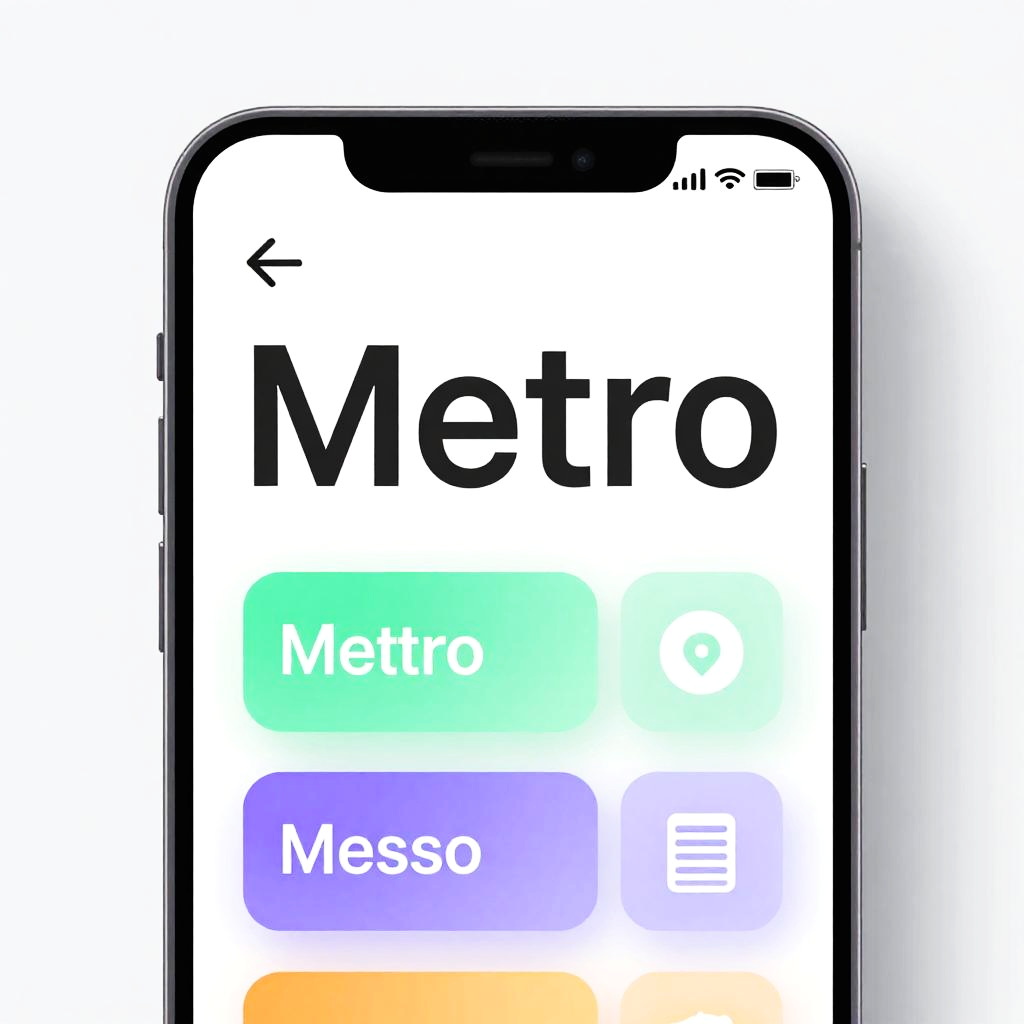 Metro font used in a sleek user interface design for a transportation app, clean and crisp letterforms, bright pastel colors, futuristic but accessible style focusing on clarity and usability