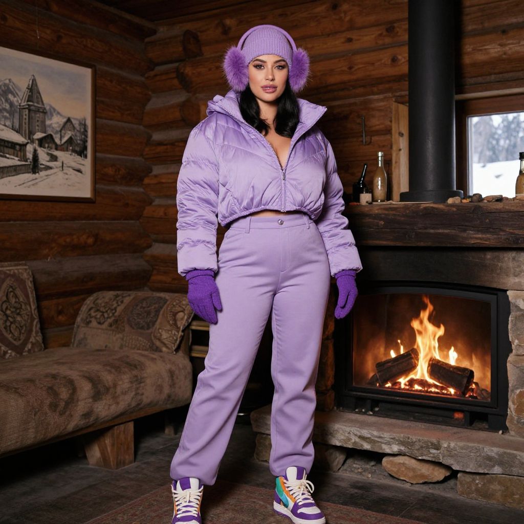 A woman, winter chic, lilac puffer jacket, hooded, cropped length, matching lilac beanie, straight-leg trousers, faux fur-trimmed earmuffs, purple gloves, multicolored high-top sneakers with purple accents, in a Wonderland night market with glowing stalls, exploring the vibrant scene, Audrey Flack style. Sexy. Pretty face and beаutiful eyes. Big breasts