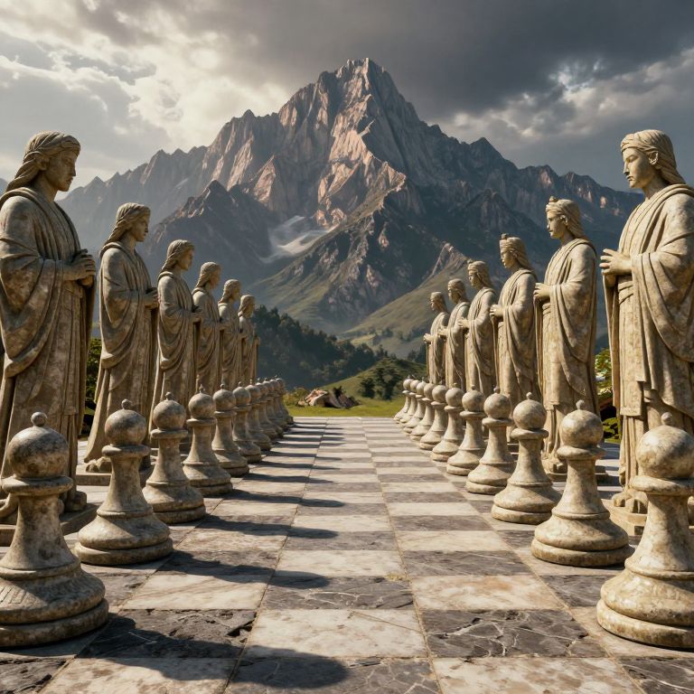 A surreal 3D-rendered scene depicts a grand, stone-paved pathway lined with rows of ancient statues, evoking the imagery of giant chess pieces, set against a majestic mountain range under dramatic lighting, blending realism with fantasy elements.