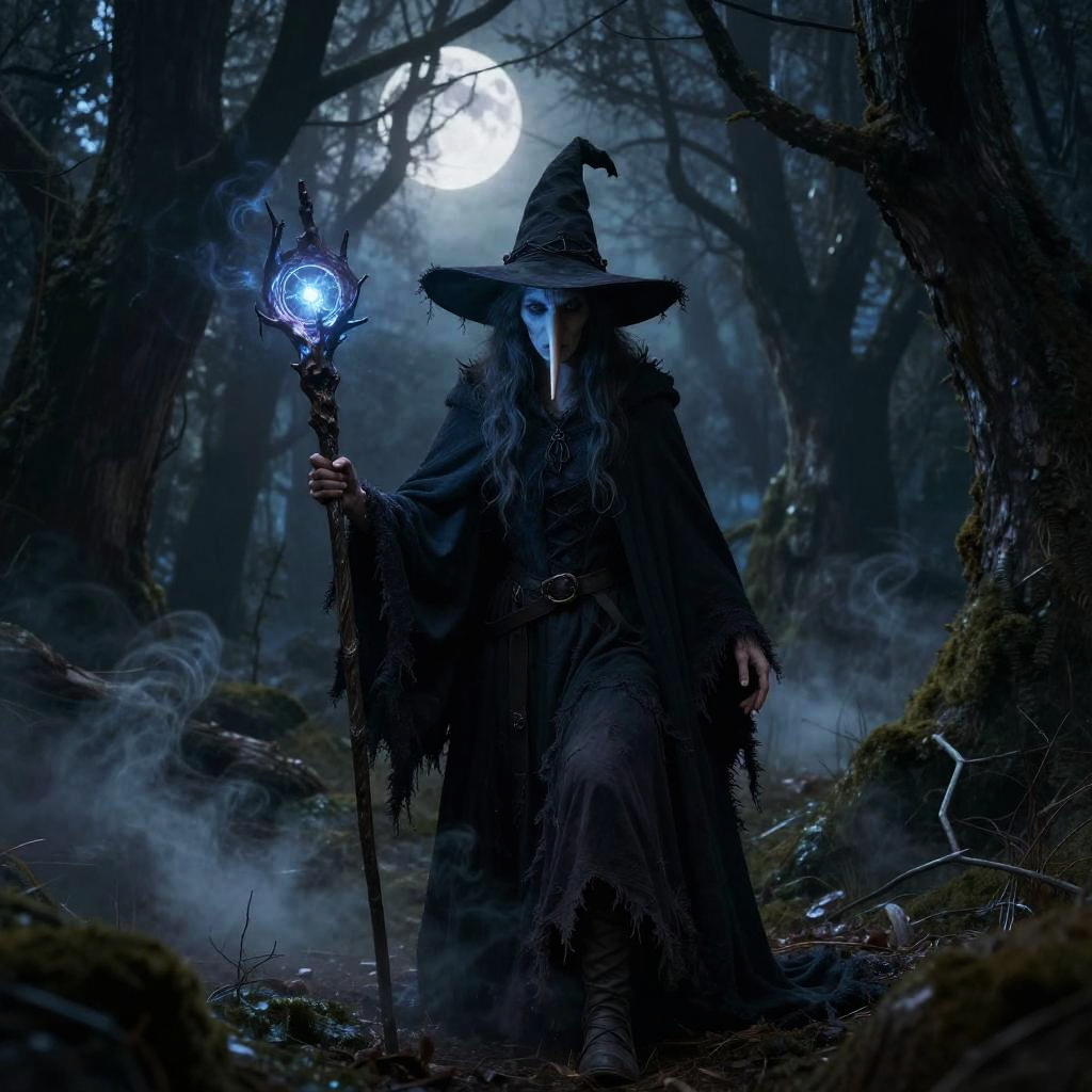 Witch with long nose standing in a dark enchanted forest, wearing a tattered cloak and pointy hat, holding a glowing magical staff, eerie mist swirling around, moonlight casting shadows on twisted trees, highly detailed fantasy art style.