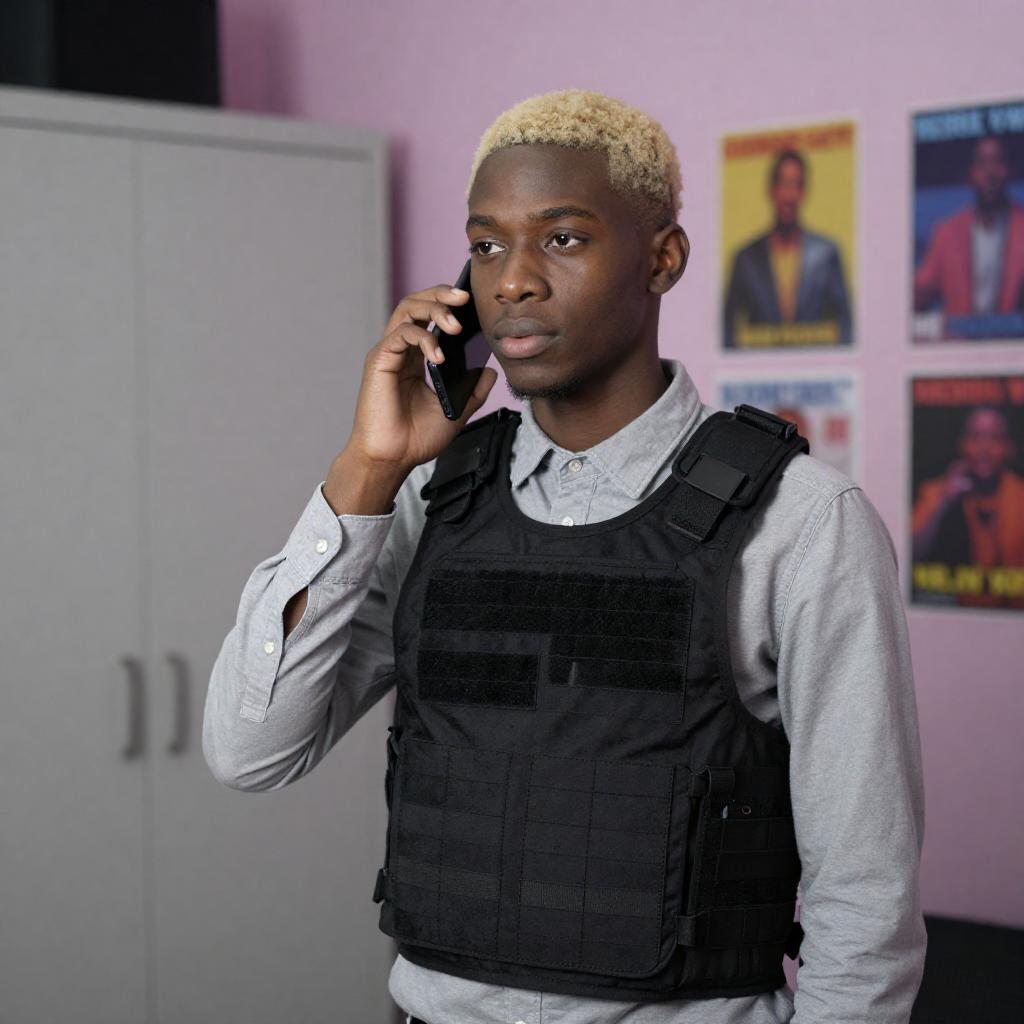 A young black man with short bleached blonde hair stands indoors. He wears a light gray shirt and a black tactical vest, holding a smartphone to his ear with his right hand. He is against a pinkish-purple wall with colorful, translucent posters to his right. A gray cabinet with vertical handles is to his left.