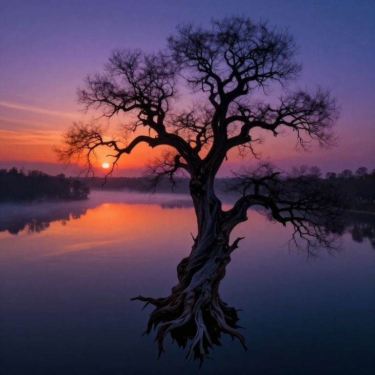 A mesmerizing blend of impressionistic techniques and digital artistry, visualize an evocative landscape that exudes haunting beauty. In the foreground, a weathered, ancient tree commands attention with its twisted branches stretching towards the heavens, enveloped in dynamic, swirling patterns of light and darkness. The background reveals an otherworldly, misty lake reflecting the mesmerizing colors of the setting sun, transitioning from intense oranges to deep purples and blues. From a distinctive aerial viewpoint, we observe this scene as if floating above it, capturing the raw beauty and serene atmosphere that provokes both tranquility and introspection.