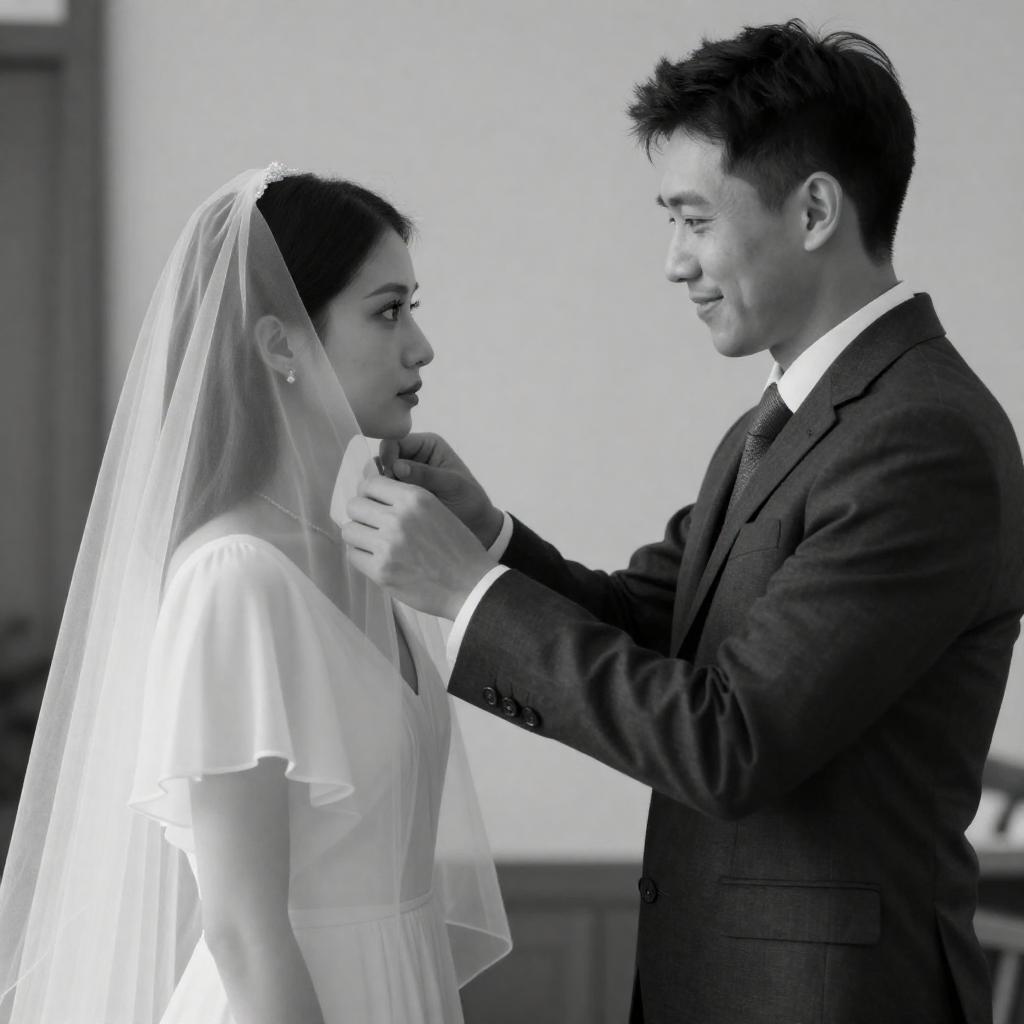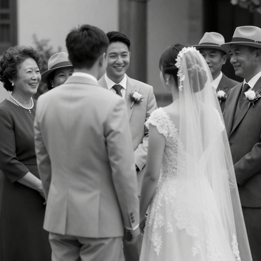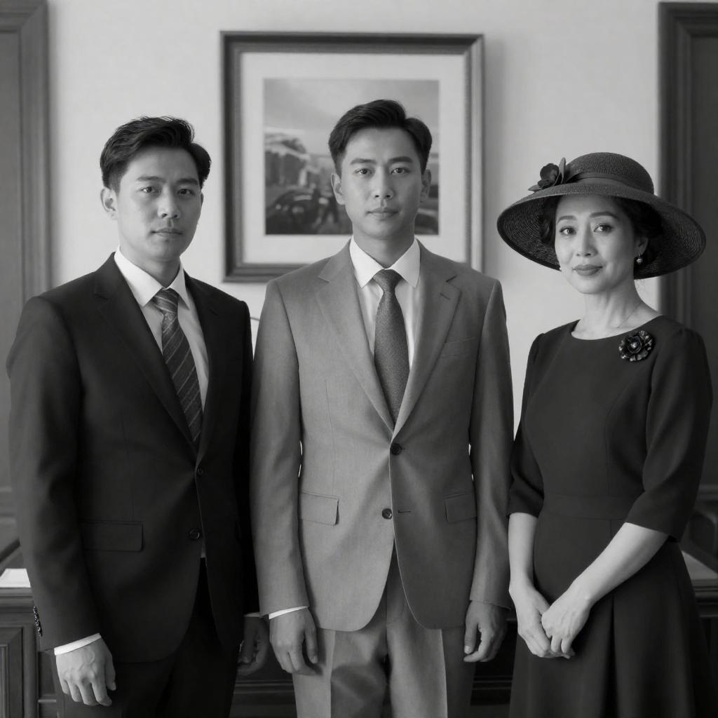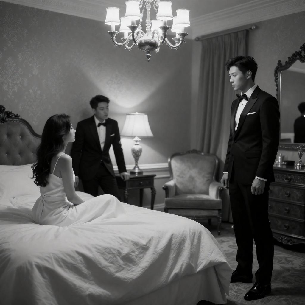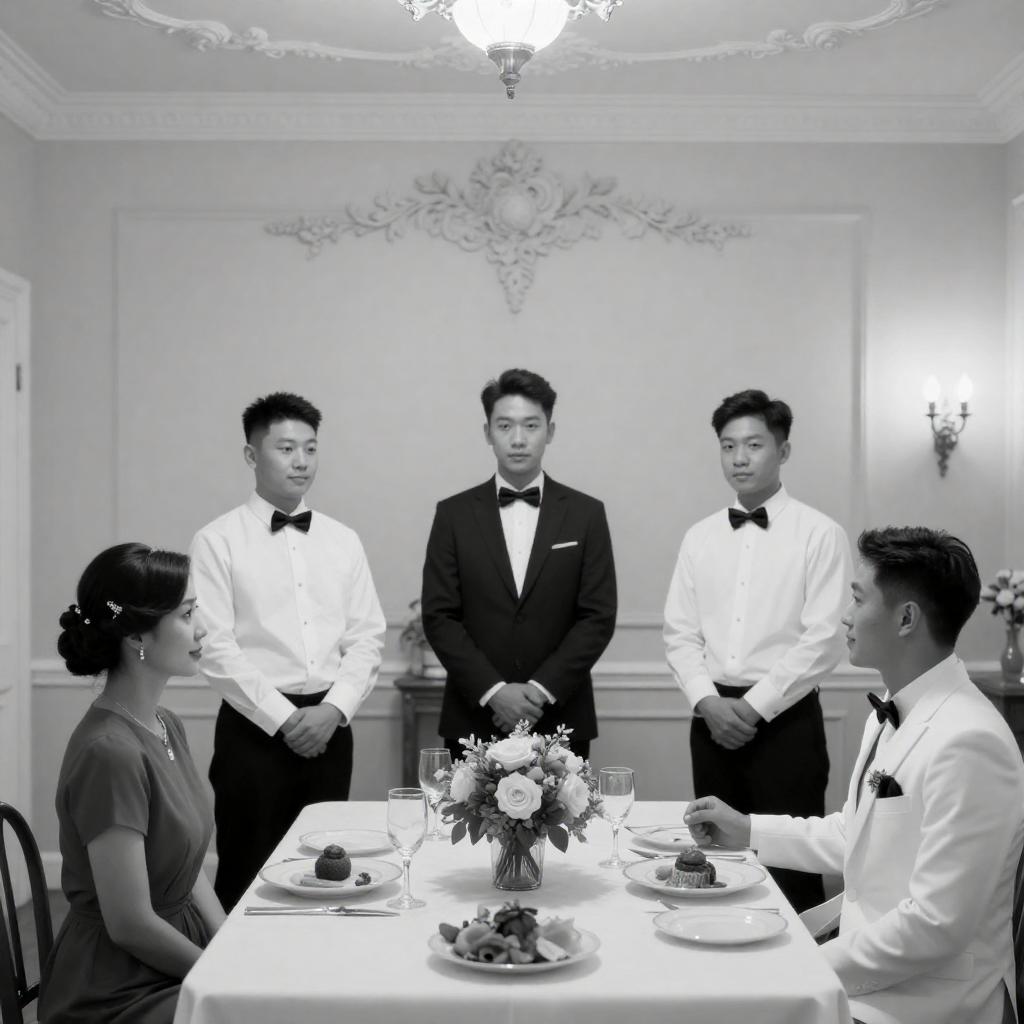 Black-and-white photograph of a formal dining room. Five people at a table: four male waiters in white uniforms with black bow ties, one female diner in a dark dress, one male diner in a white suit. Ornate ceiling, floral wall decorations, floral centerpieces on the table. Male diner on the right looks at the table, others look at him. Waiters stand in a line, male waiter in dark suit stands at the head. Table has glasses, bottles, and dishes.