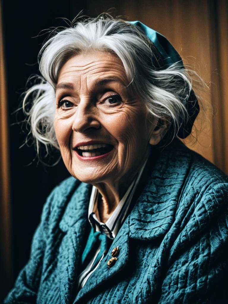 Portrait of an elderly woman with white hair wearing a dark vintage coat with white trim and a light blue shirt. She is outdoors in a natural setting and giving a thumbs up gesture with an expressive facial expression.