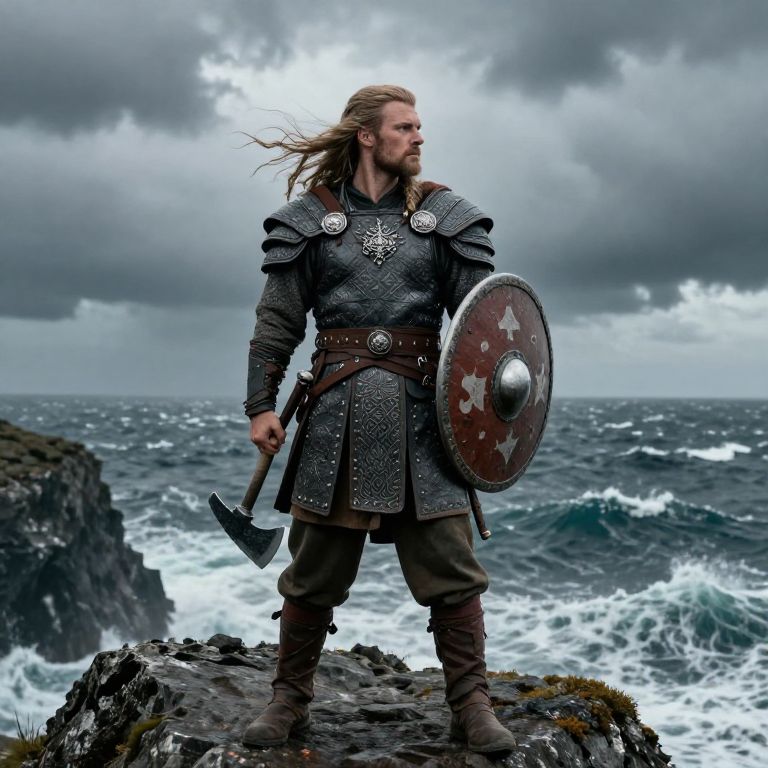 Vikinga warrior standing on a rugged cliff overlooking the stormy sea, clad in authentic Norse armor with intricate patterns, holding a battle axe and shield, long braided hair flowing, dramatic cloudy sky, epic and heroic atmosphere