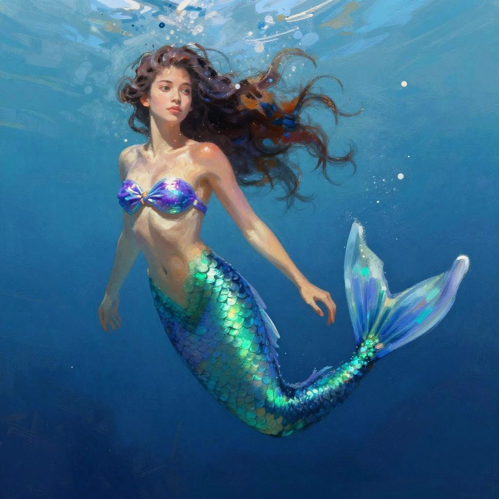 Realistic photo.A fantasy illustration of a fierce mermaid warrior guarding her underwater realm, surrounded by corals, shipwrecks, and schools of fish, in a vibrant ocean depth, created in fluid watercolor, dark and atmospheric realistic photo
