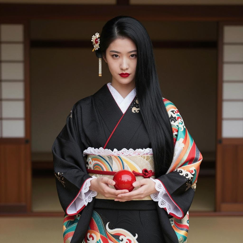 Photograph of a young woman with pale skin and black hair in a white kimono with red accents. She holds a red translucent veil over her head. She has intense, neutral facial expression. Red obi belt is tied at her waist. Background features a tree with white cherry blossoms. She stands centered, facing forward.