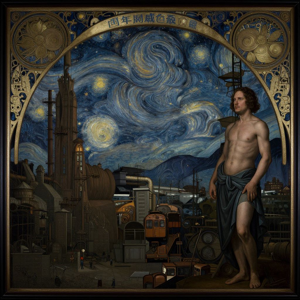 Industrial portrait of the night sky as a man dark ambiance mix of realism and art nouveau symbolism rennisance painting voulmetric lighting,