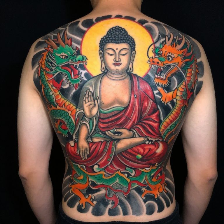 Photograph of a person's back covered in a vibrant, detailed tattoo. The tattoo features a red-robed deity with a halo and wings, surrounded by colorful clouds and flowers, and a serene, smiling face on the left side. The black background contrasts with the bright, intricate colors of the tattoo, highlighting its artistic style and complexity. The person's dark hair is partially visible.