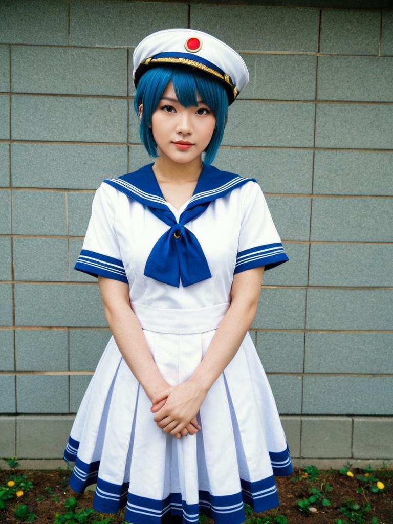 Photo-realistic cosplay of a person wearing Aika Granzchesta costume featuring a white and blue sailor-style Himeya Company uniform dress with yellow buttons, brown belt, and matching white hat with a red emblem. The subject has blue hair, yellow and brown eyes, and is wearing earrings. The image is a full body shot taken outdoors in a wooded area.