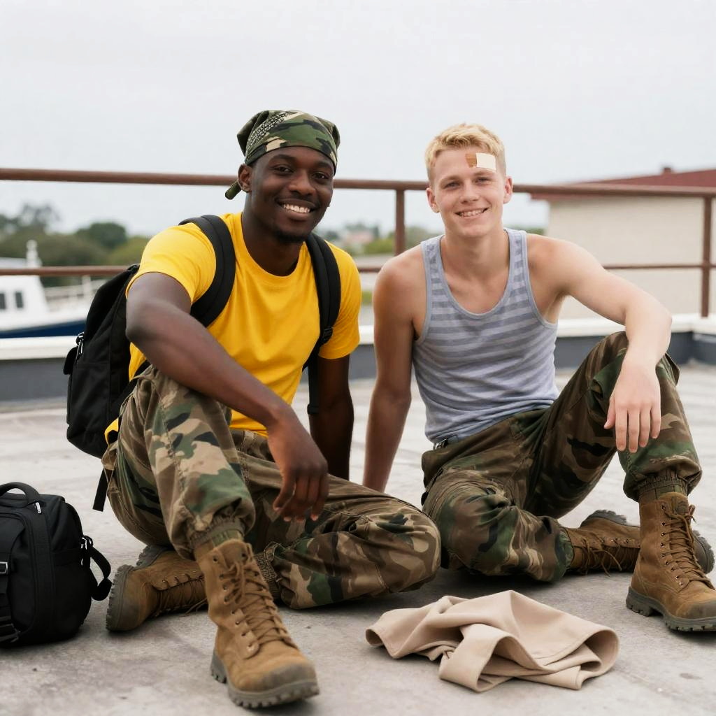 Photograph of two men sitting on metal stairs. Foreground man with short curly hair, camo jacket, headband, holding a rifle, intense expression. Background man with short blonde hair, striped tank top, neutral expression. Bright lighting, ladder in background.