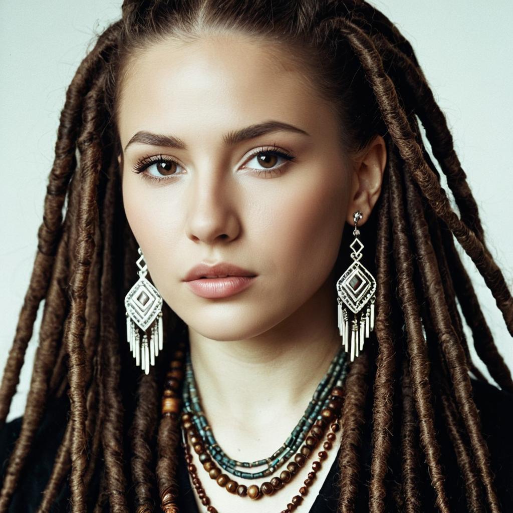 All blonde faux locs, photorealistic, close-up, young white woman, large blonde dreadlocks, blue eyes, light makeup, wearing green shirt, layered necklaces, teardrop earrings, serious expression, blurry background, natural light, detailed hair ure, subtle shadowing, bokeh effect, soft focus, realistic skin ure, fashion style, modern casual look