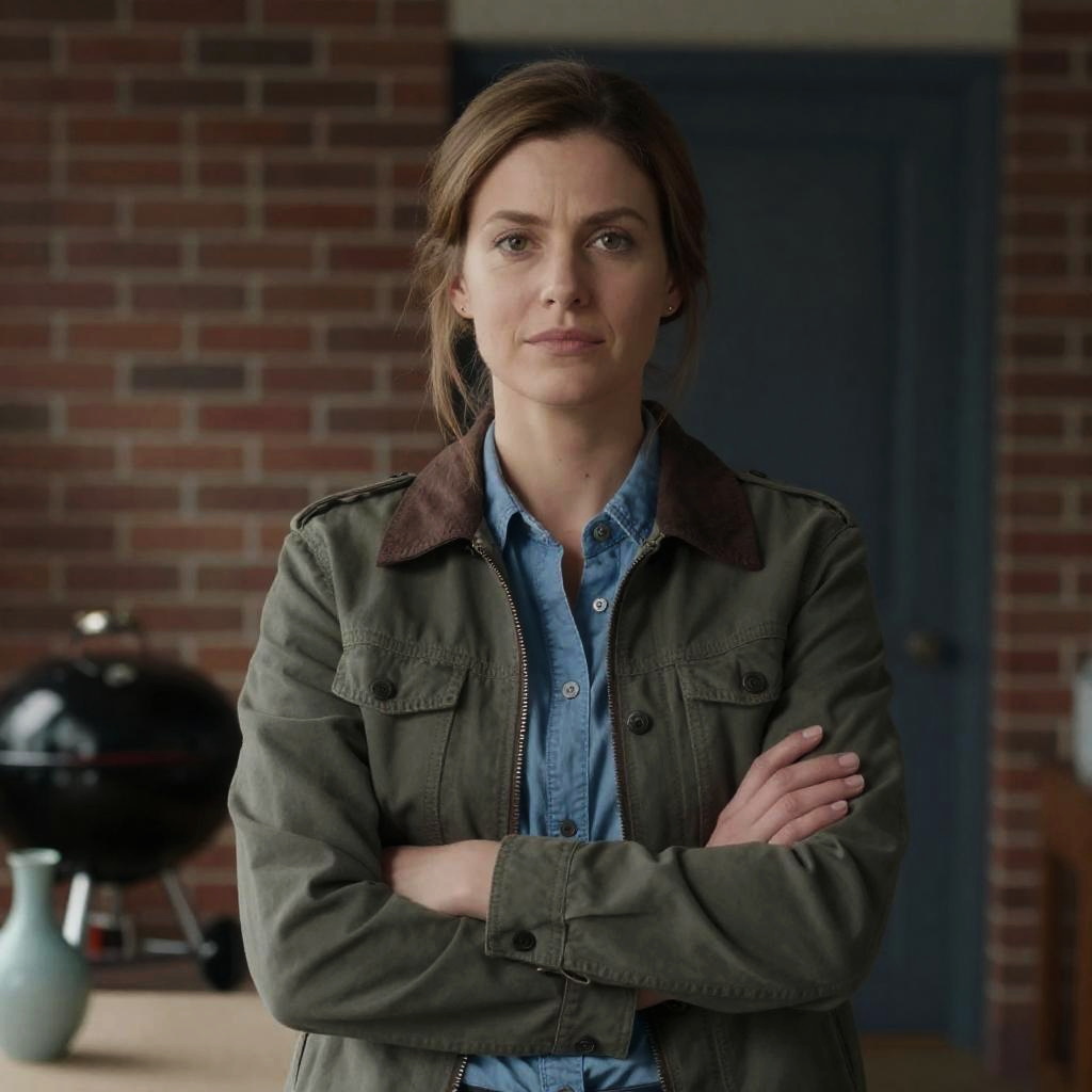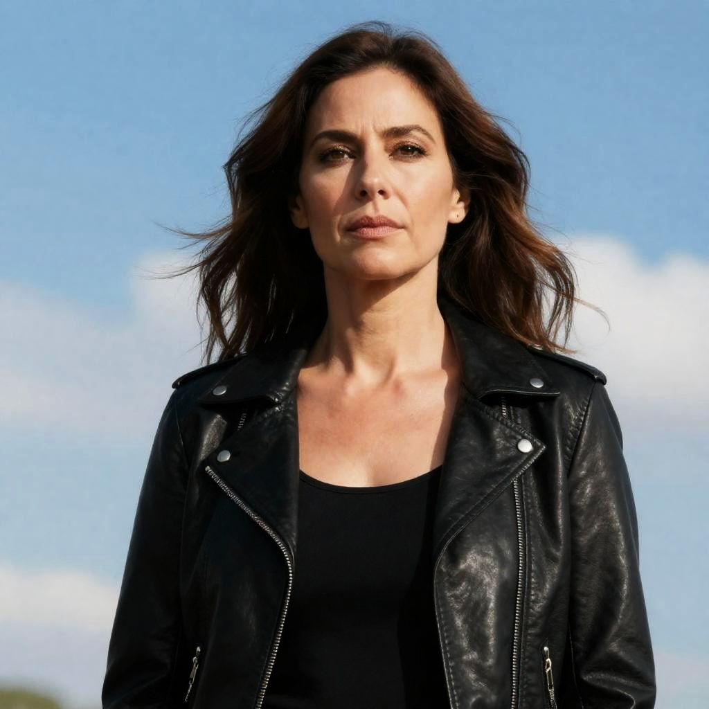 Photograph of a woman with dark hair in a navy blue jacket, standing on a boat ladder. She holds a black phone to her mouth, speaking intensely. Boat interior background with metal railings and sunlight. She grips the ladder with her right hand.