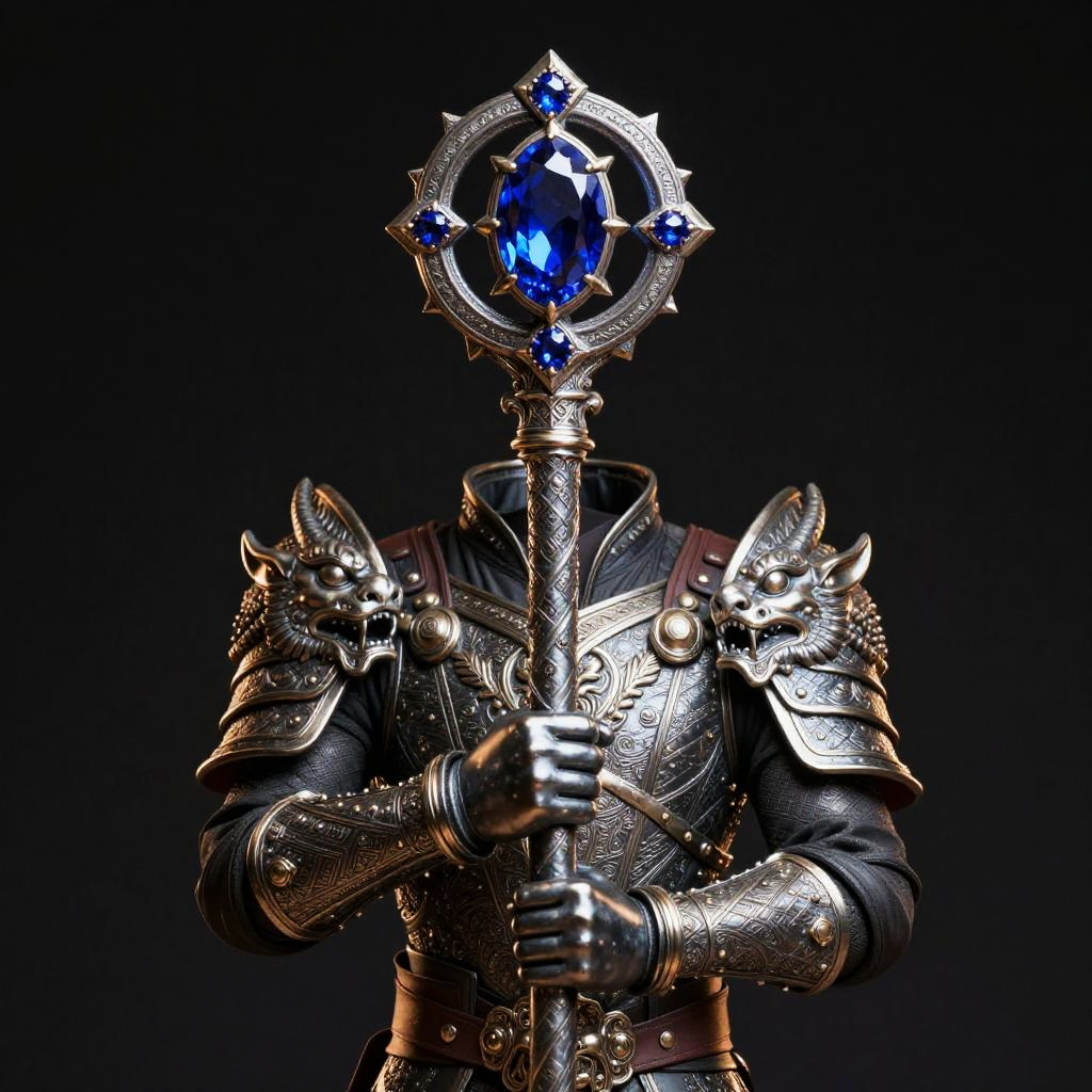 Ornate staff embedded with mythical creatures designs, shining metallic finish, gleaming sapphire embedded at the top, fantasy warrior gripping it firmly, dramatic lighting