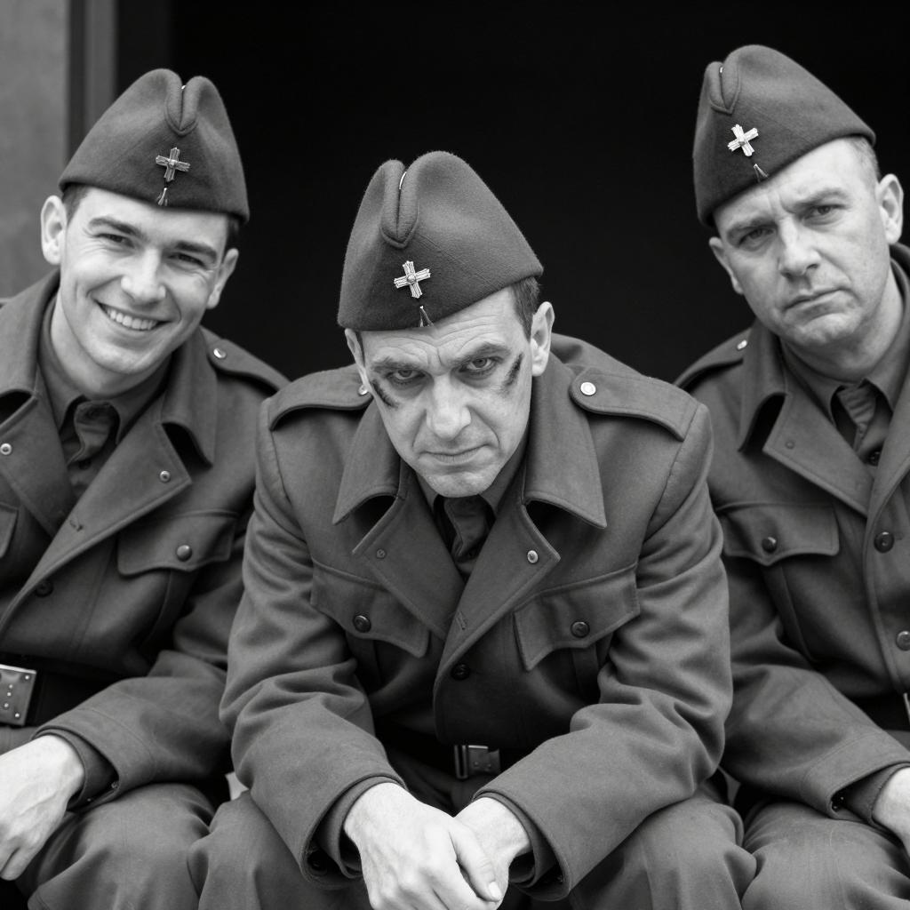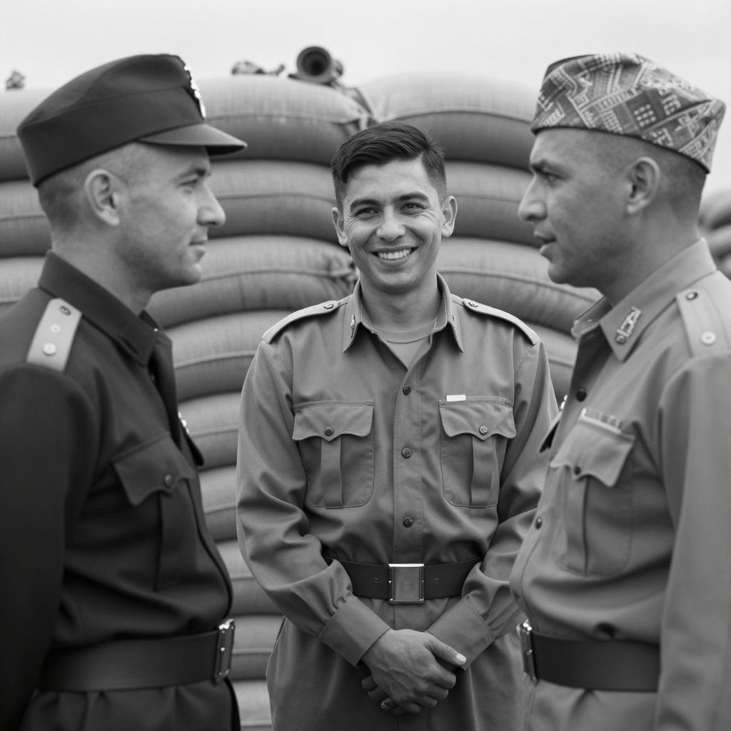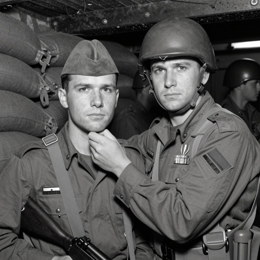 Black and white photograph of two soldiers in a military bunker. Soldier on right, wearing helmet and uniform, grips the chin of soldier on left, who wears a hat. Background filled with sandbags. Both have intense expressions. Soldier on right has a medal on chest. Other soldiers in background, partially visible. Soldier on left holds a rifle.