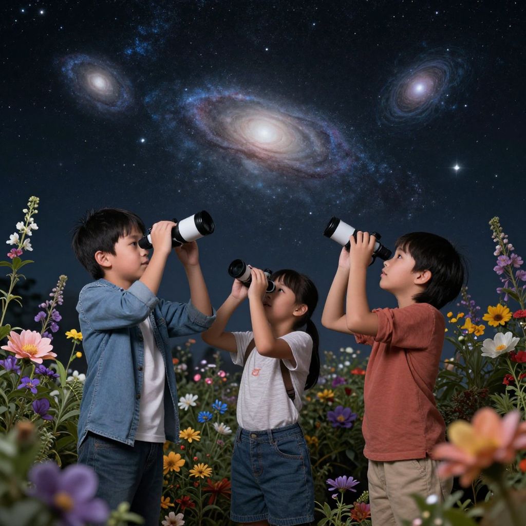 Photograph of three Asian boys, ages 6-8, standing in a colorful, vibrant flower field at night. They are looking up through binoculars at two bright, glowing galaxies in a starry sky. The boy on the left wears a denim jacket and jeans, the middle boy a white t-shirt, and the right boy a red t-shirt with beige pants. The flowers include pink, yellow, purple, and white blooms. The boys have short black hair and are focused, with curious expressions. The image blends realism with a touch of fantasy, emphasizing the awe of childhood discovery against a cosmic backdrop.