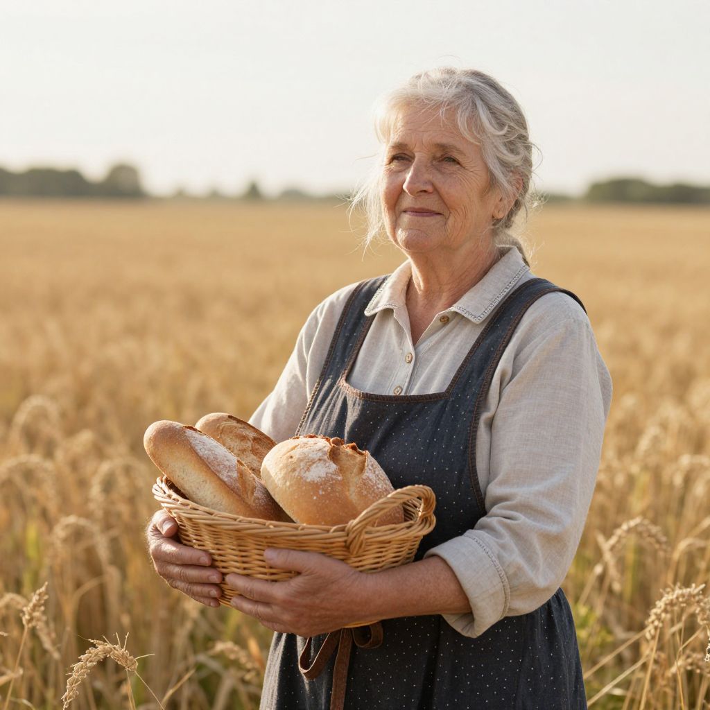 Photograph of an elderly white woman with gray hair, wearing a blue, sleeveless, embroidered dress over a white blouse, standing in a golden wheat field at sunset. She holds a wicker basket filled with three long, crusty baguettes, dusted with flour. Her expression is gentle and content, with a slight smile. The background is a blurred, expansive wheat field, with the sun low on the horizon, creating a warm, glowing light. The texture of her dress is coarse, and the baguettes appear freshly baked. The overall atmosphere is rustic and pastoral.