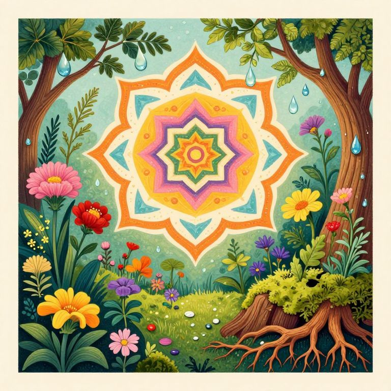 A vibrant, highly detailed folk art print depicting a magical, peaceful garden with flowers, herbs, and a mandala, featuring elements like dewdrops, moss, roots, wood, and morning light, evoking a spiritual and organic atmosphere reminiscent of the 1960s.