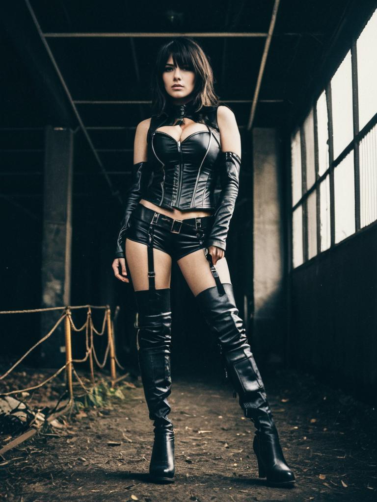 Woman in Thigh High Boots Outfit costume, cosplay editorial portrait, photorealistic tones