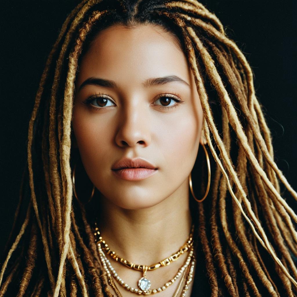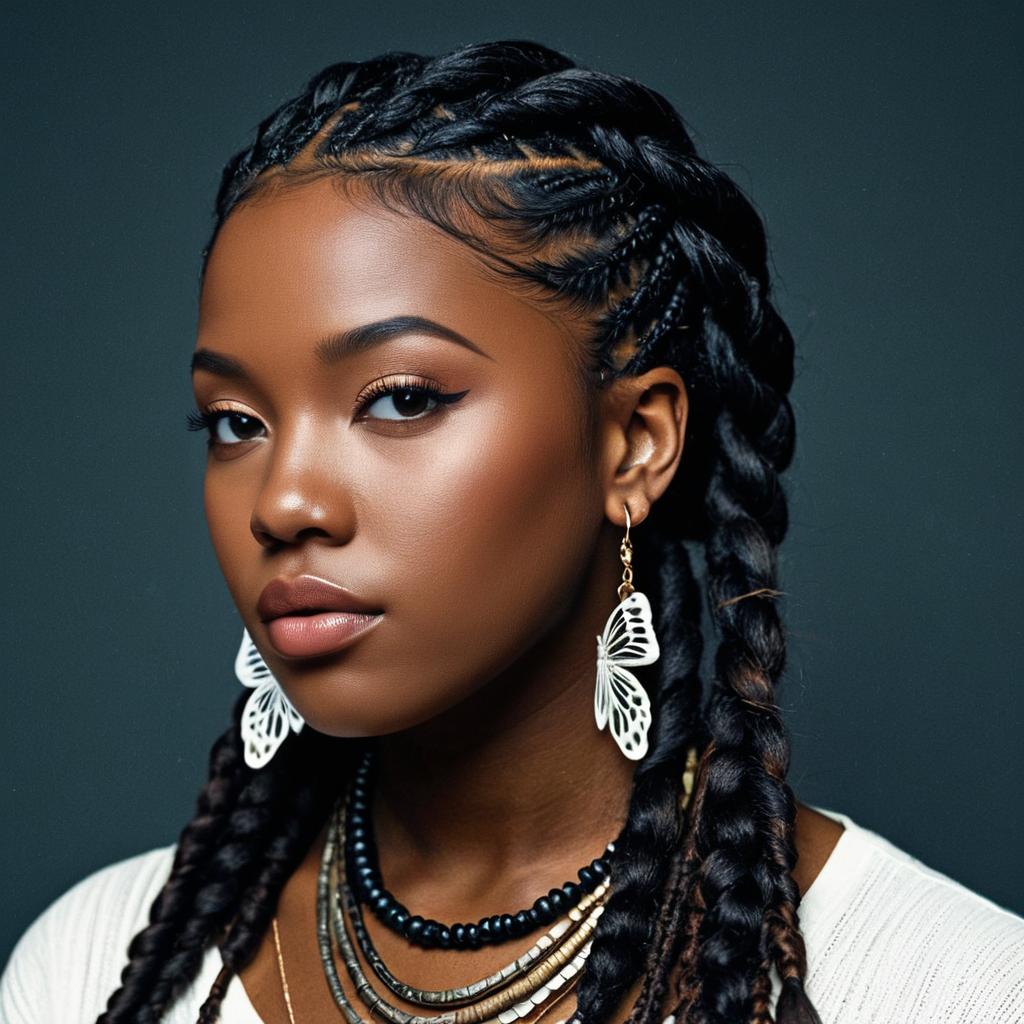 Crochet butterfly locs short ,1girl, bug, solo, butterfly, jewelry, dreadlocks, multiple braids, brown hair, long hair, necklace, looking at viewer, realistic, upper body, earrings, short sleeves, lips