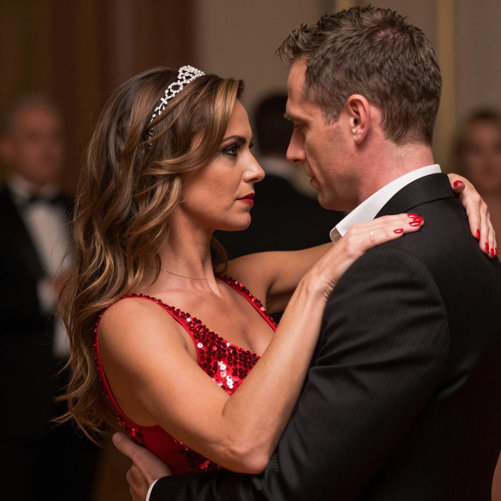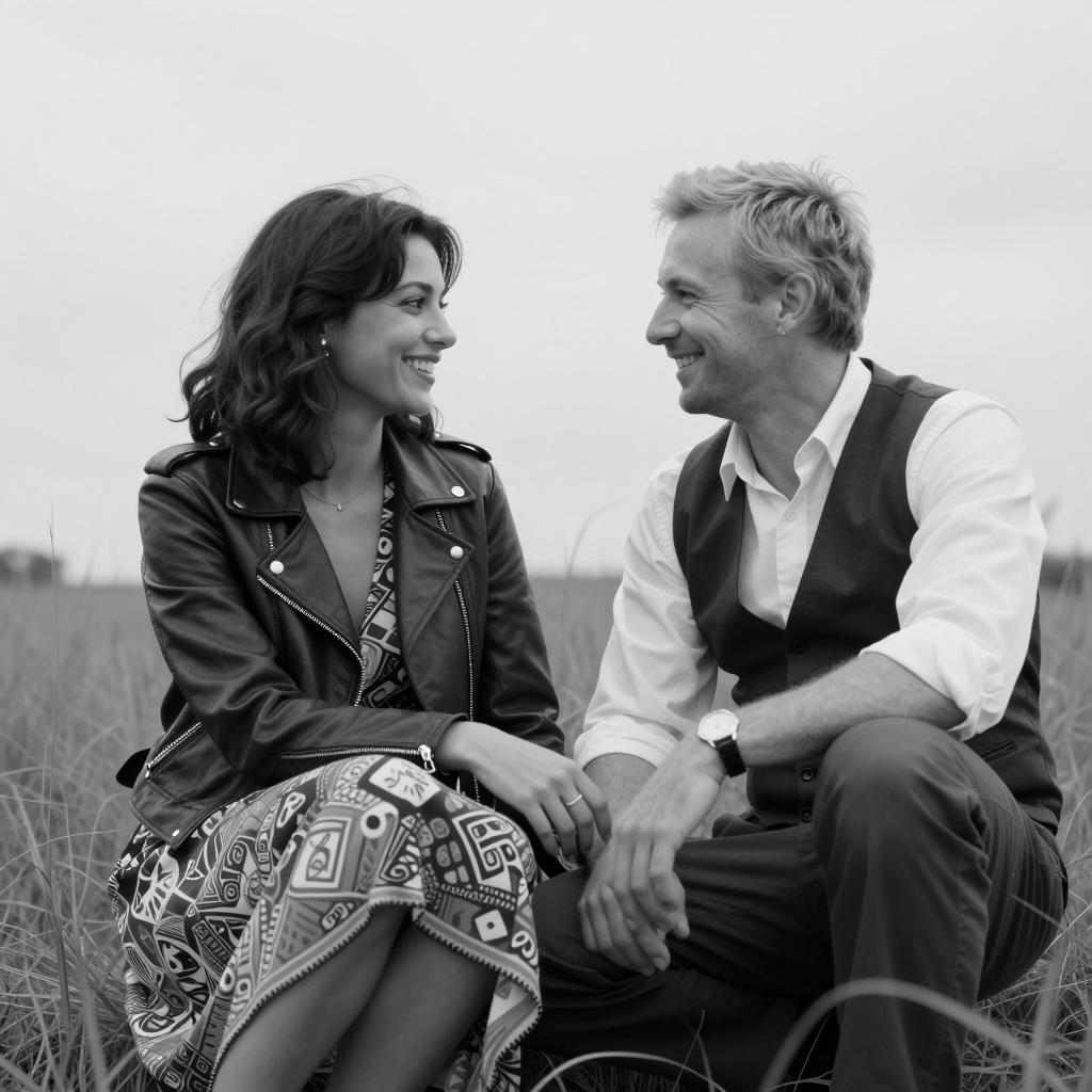 Photograph of a couple in a rain shower. Woman with long black hair, wearing a black dress, leans into a man with short brown hair, wearing a light gray suit. She grasps his lapels, he looks at her. Green bokeh background. Rain streaks across the image. Both have intense expressions. Man's face partially turned. Woman's right arm raised.