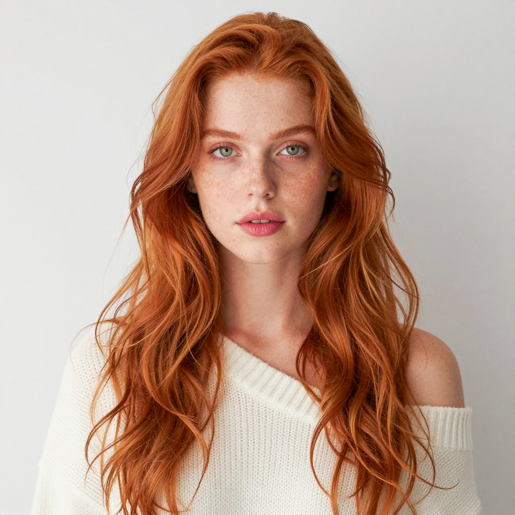 Photograph of a young woman with long, wavy, red hair covering her shoulders. She has light green eyes, fair skin with freckles, and full, pink lips. She wears a white, off-the-shoulder sweater. Her expression is neutral. The background is a plain, light gray wall. Her hair and eyes are the focal points.