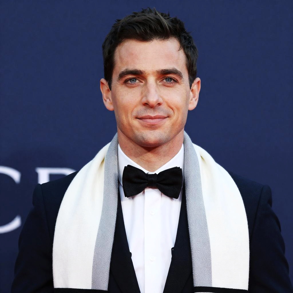 Photograph of a middle-aged man with short dark hair, blue eyes, and a slight smile, wearing a dark suit and tie. He is looking directly at the camera with two white dress shirts and black bow ties in the foreground. The background is blurred with blue lighting. The man's expression is friendly and approachable. He is positioned slightly to the right, with the dress shirts and bow ties in the foreground.