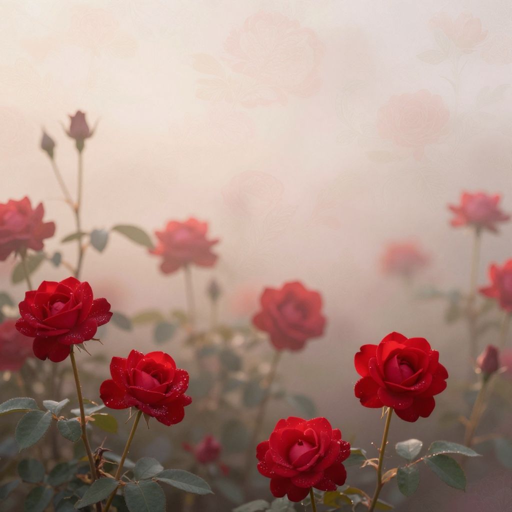 Red roses aesthetic wallpaper, a dreamy garden filled with blooming crimson roses, soft morning light casting gentle shadows, intricate petals with dewdrops, elegant vintage style, pastel background blending seamlessly with delicate rose patterns, high resolution