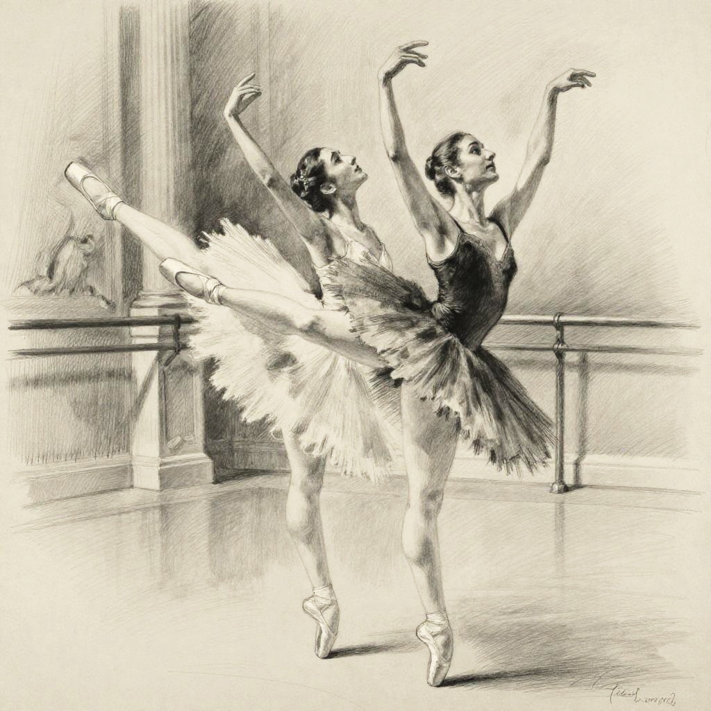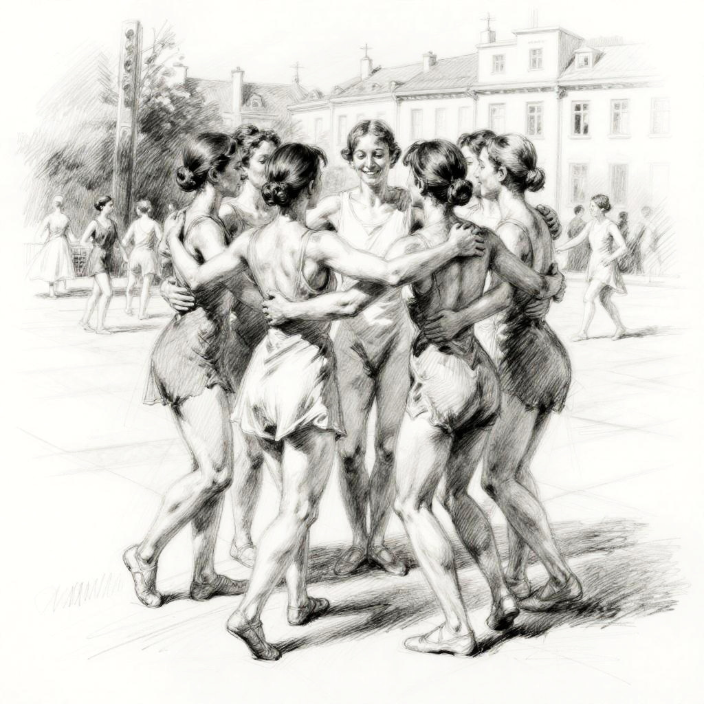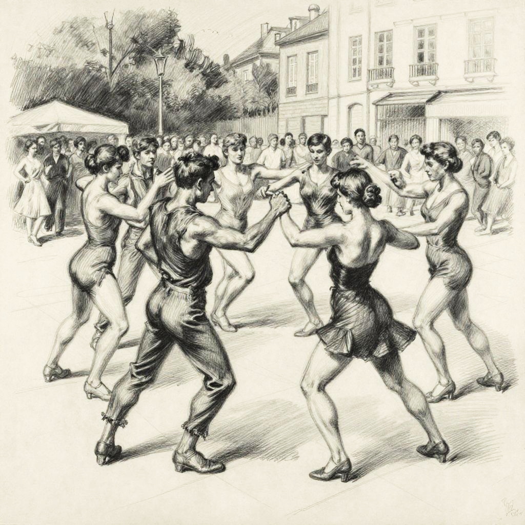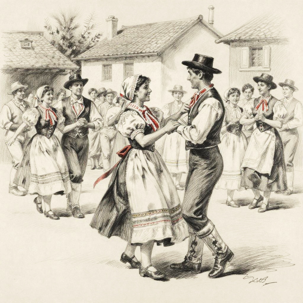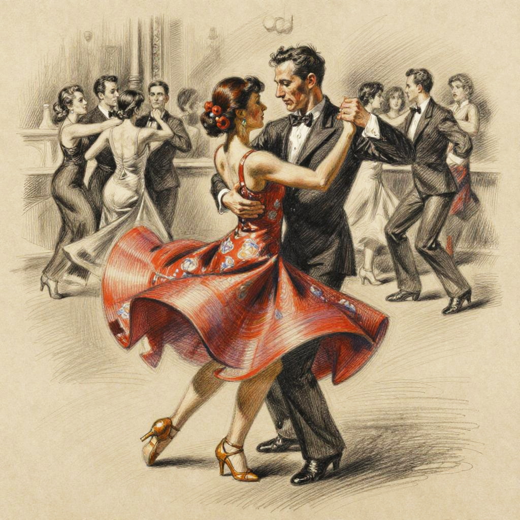 Illustration of a dancing couple in vibrant red attire, surrounded by black-and-white ballroom dancers, showcasing elegant, classic ballroom style.