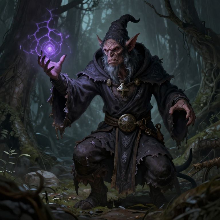 Digital fantasy artwork of a menacing, humanoid orc with pointed ears, gray beard, and wrinkled skin, crouching in a dark, misty forest. He wears a tattered, dark purple robe with intricate patterns, a large belt with a circular buckle, and a black, horned hat. His right hand, glowing with a purple, hexagonal magical aura, is raised menacingly. His left hand is outstretched towards the ground. The forest background is dense with shadowy trees and underbrush, adding to the eerie atmosphere. The orc's expression is fierce and intimidating.