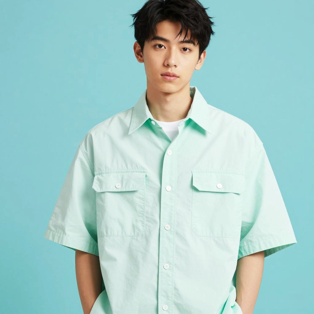 This vibrant image features a young man dressed in a stylish, mint-green oversized shirt, exuding a modern and trendy aesthetic. The striking turquoise background adds to the contemporary vibe, making it perfect for fashion editorials or marketing purposes.
